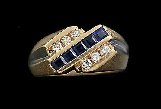 Striking Modern 14k Yellow Gold Diamond & Blue Sapphire Ring Size 8.75