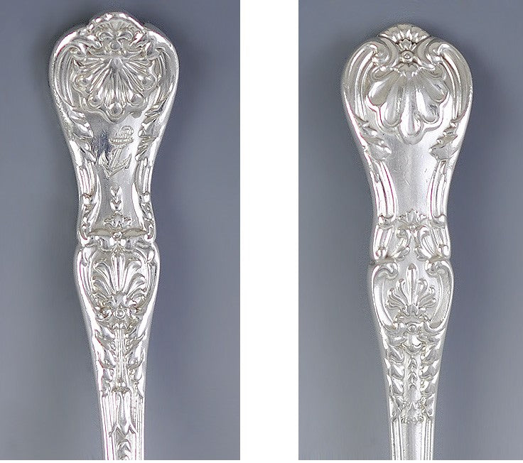 Presented is a fine quality set of 10 sterling silver seafood or cocktail forks by Gorham, in the New Queens pattern, patented 1895. These are smaller size forks than dinner forks, with three wide tines, the outermost of which have an outward curve. The handles and shoulders are decorated with a lovely shell and wheat leaf motif, front and back. The handles all have a monogrammed crest of an anchor. These are beautiful heavy pieces, very well made, and would be an asset to any table.