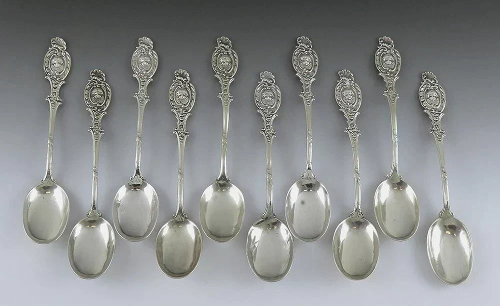 Presented is an antique set of 10 German silver demitasse or coffee spoons made during first quarter of the 1900s. Each handle is beautifully decorated with scroll and shell designs. The front of each handle also has a lovely little cherub or puti face. The spoons are not monogrammed.