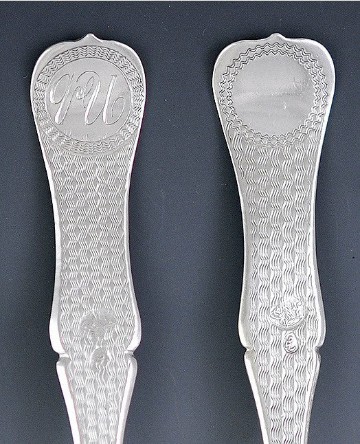 Presented is a fine set of 10 Turkish silver teaspoons. The teaspoons have a nice design with a cartouche at the top and elegant wavy engraving along the handle. The spoons are well made and quite heavy. Two of the spoons have a different pattern than the rest, and two other spoons are monogrammed with the initials VU. Eight of the spoons have never been monogrammed. I do not know exactly when the spoons were made, but I suspect in the late 1800s.
