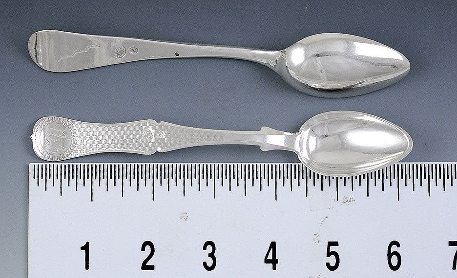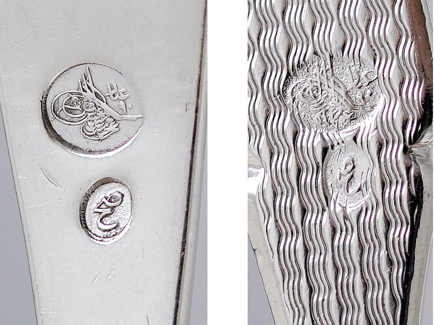 The spoons are hallmarked on the handles with the Turkish tourgha mark on the front and the assay test mark on the reverse. We have tested them with nitric acid and guarantee to be a minimum of 800 purity silver.