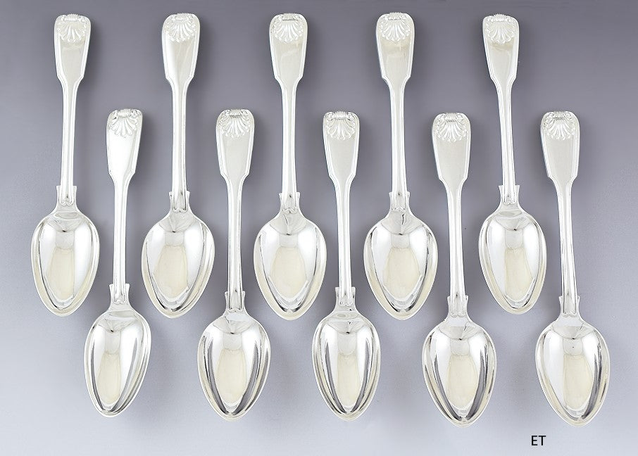 Presented is a fine set of 10 English Georgian sterling silver place, dessert, or oval soup spoons. Six of these spoons were made by A. B. Savory & Sons in 1833, while the remaining four were made by Charles Eley and date to 1826. Regardless, they are all a perfect match in terms of size, style, and quality, stacking perfectly. The spoons are made in a classic Fiddle, Thread & Shell pattern, fabulously decorated with a shell design on the front and back of the handle as well as the back of the bowl. The spoons are quite well made and handsome, with a nice feeling of weight in the hand.