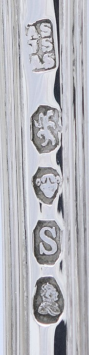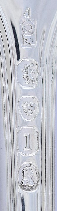 Six of the spoons are hallmarked on the stem with the lion passant for sterling silver, the leopard's head for the city of London, the date letter S for 1833, King George IV's head duty mark, and the maker's mark for Adey Bellamy Savory, Joseph Savory II & Albert Savory. The other four spoons are hallmarked on the stem with the lion passant for sterling silver, the leopard's head for the city of London, the date letter l for 1826, the King George IV's head duty mark, and the maker's mark for Charles Eley.