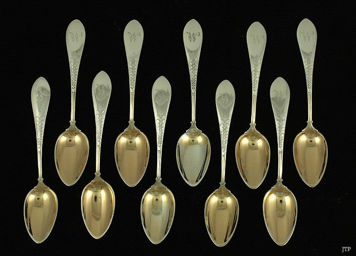 Presented is a wonderful set of 10 old sterling silver chocolate spoons or coffee spoons made by Gorham Manufacturing Company. The spoons are done in the Palm pattern which was first produced in 1871. Each spoon is engraved with a W in Gothic script on the end of the handle. The bowls are covered with a handsome gold wash.