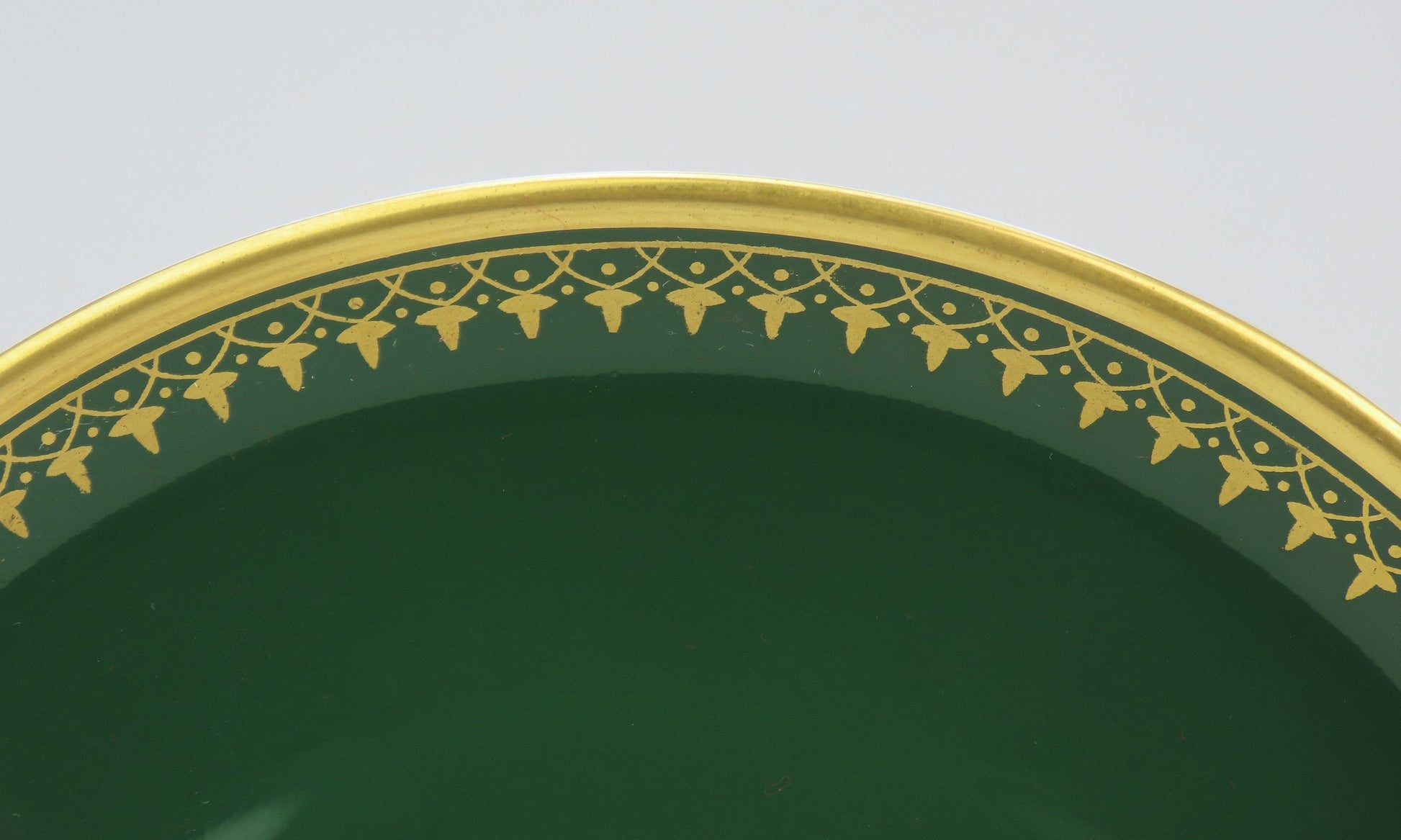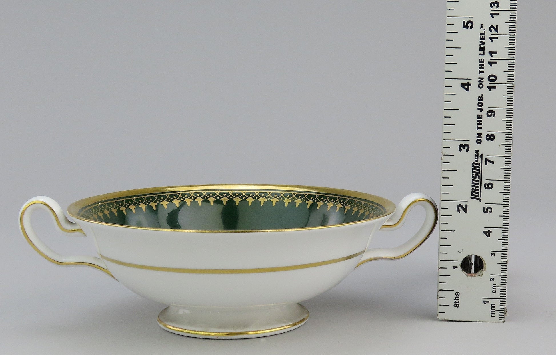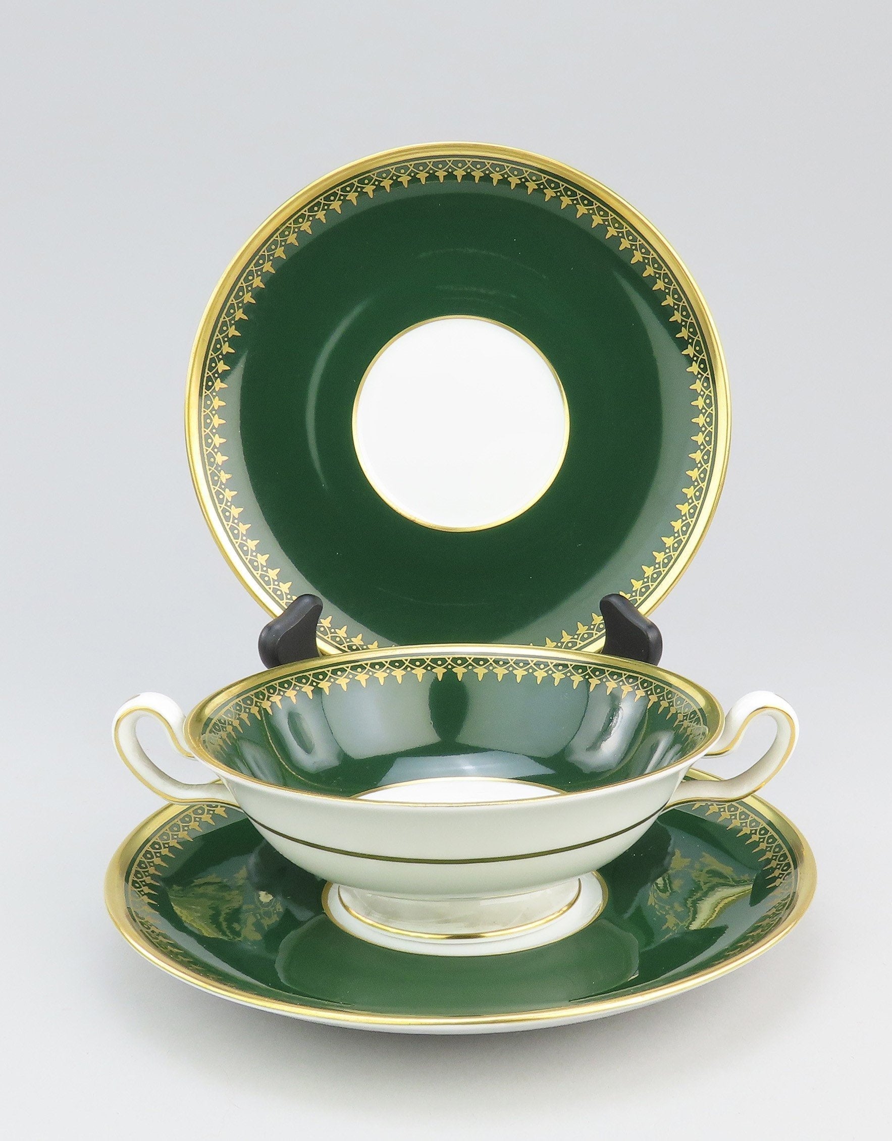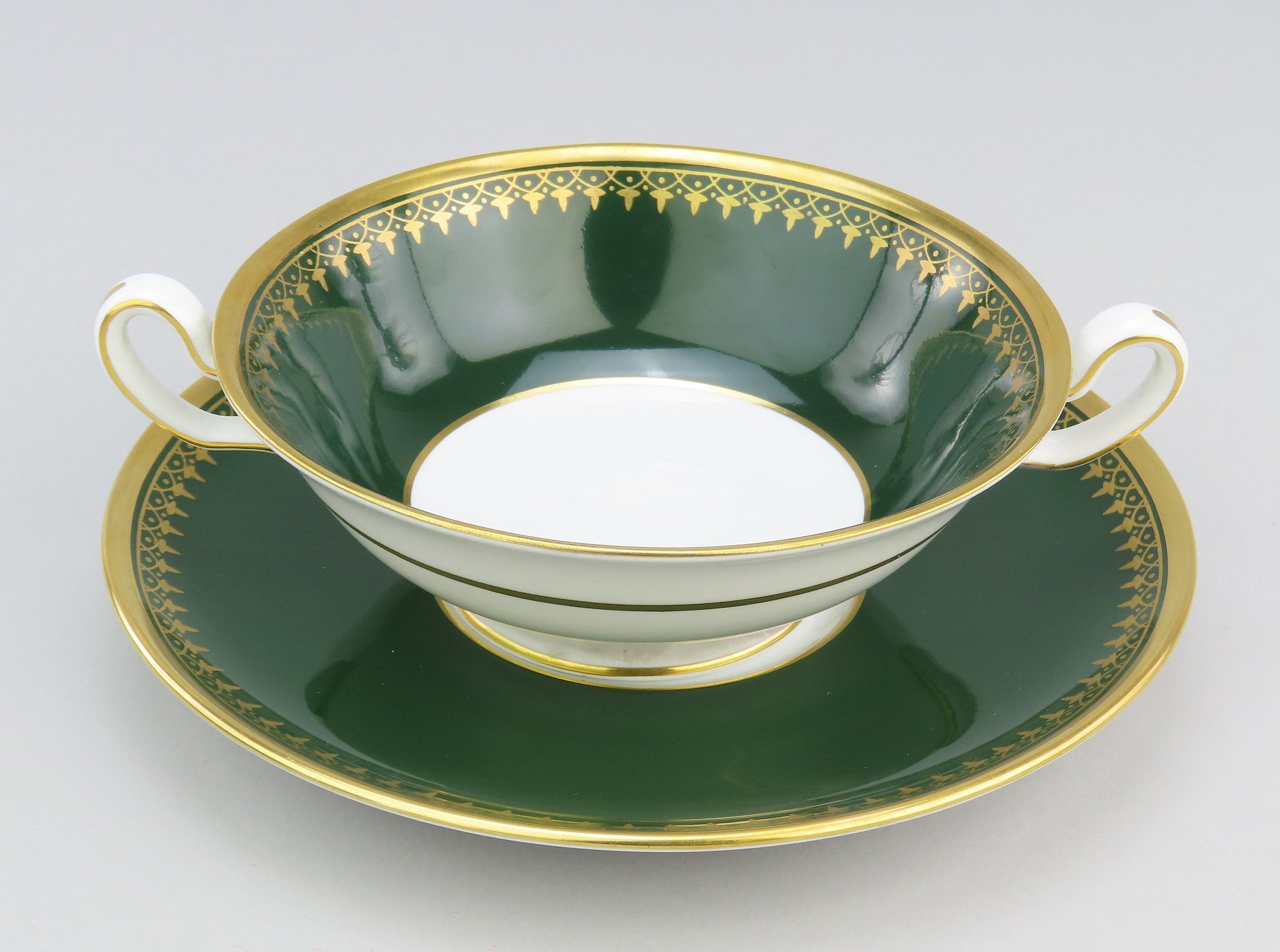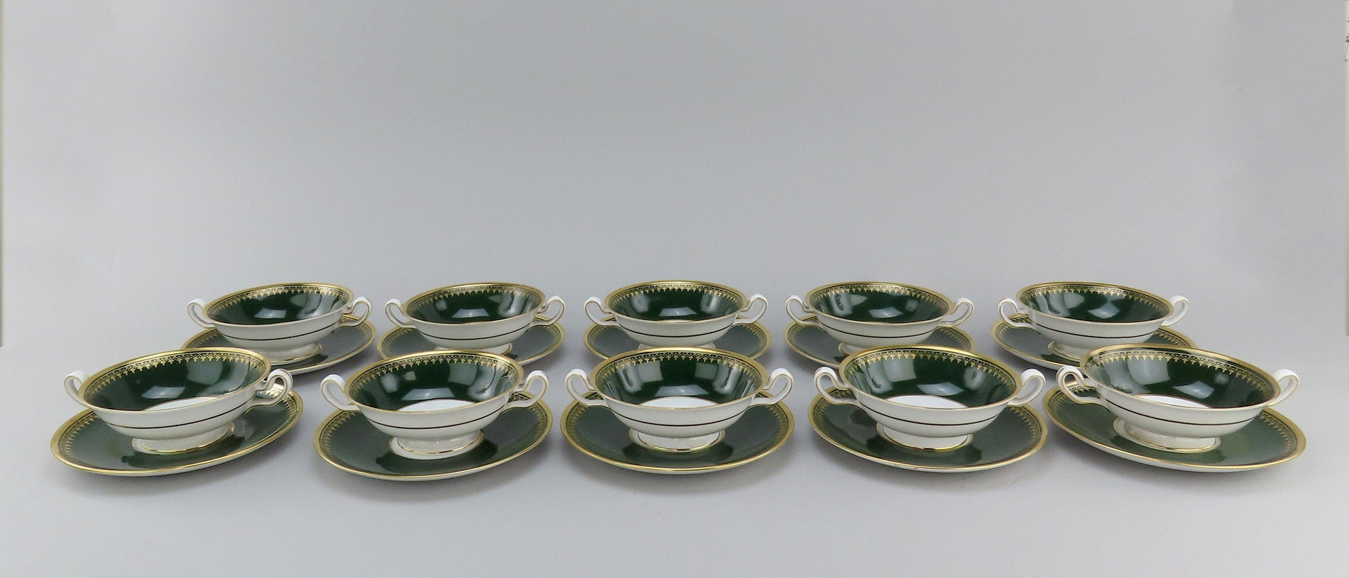 Presented is a set of 10 porcelain 2 handled bullion broth bowls with underplates from Spode. This set is not a named pattern. All piece are marked with a pattern number: Y7392. The pieces are decorated with a wide forest green border and a fancy gold trim.