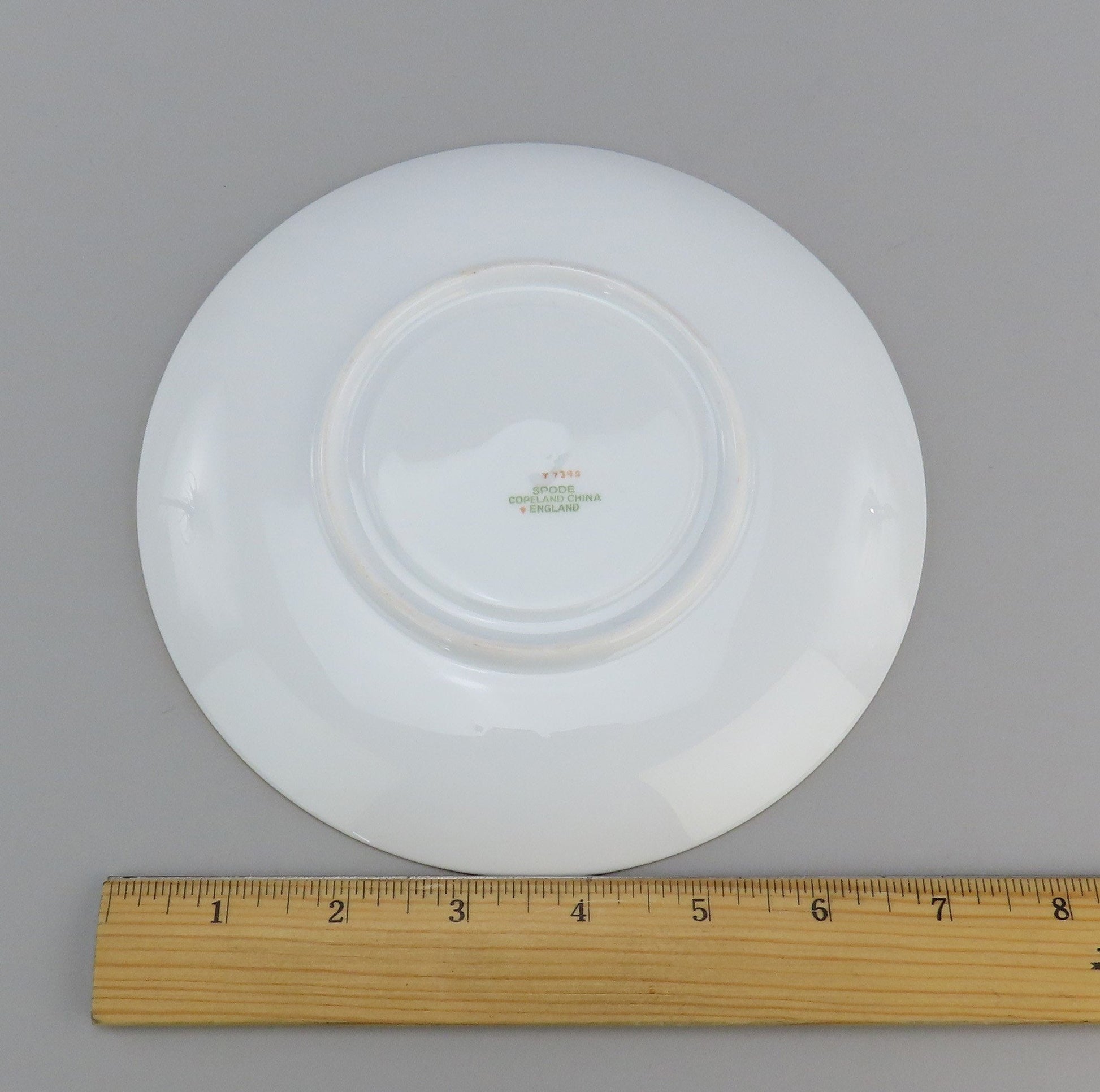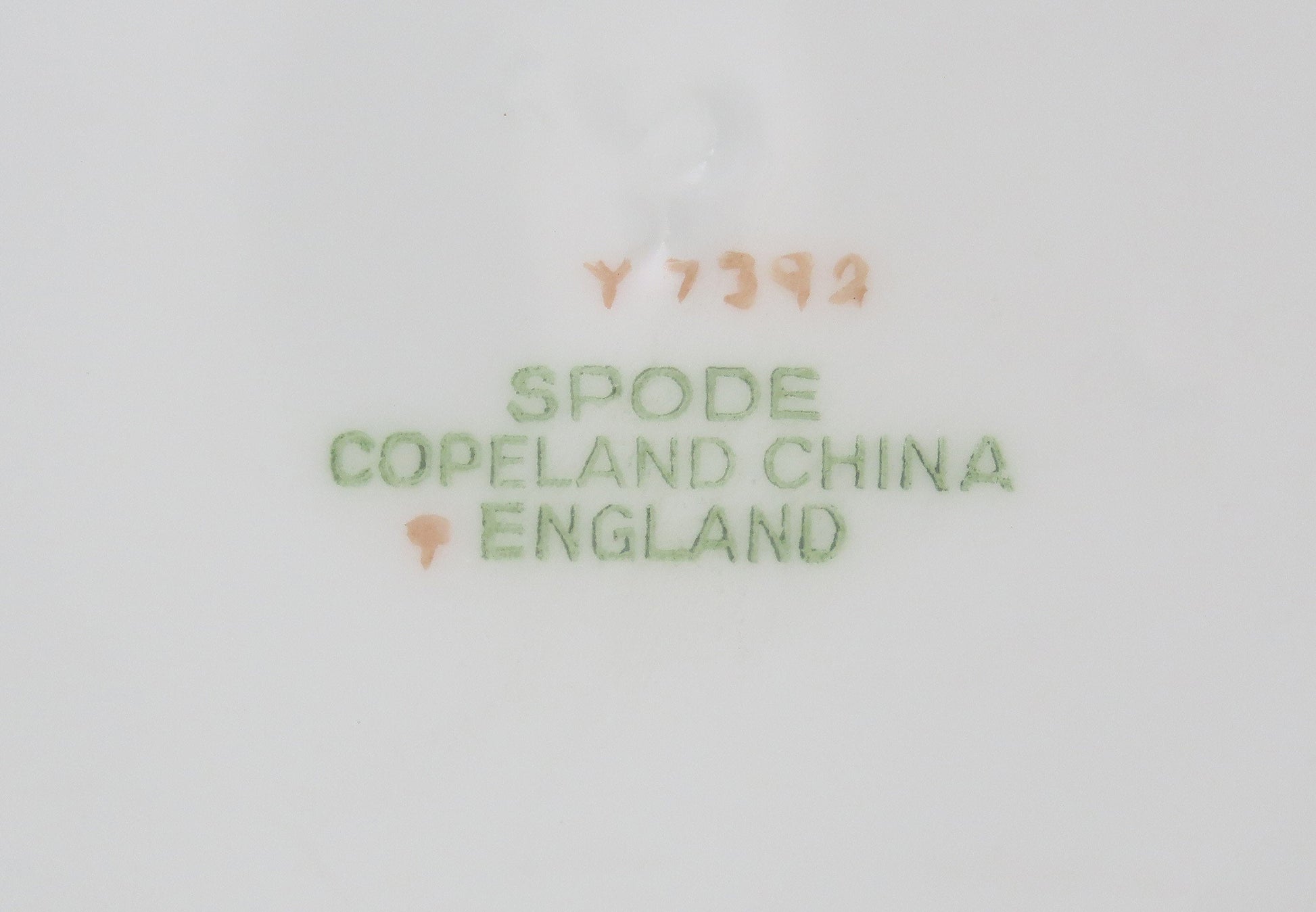 The underside of each piece is mark with “Spode Copeland China England”. Each plate is also stamped under the glaze with a date mark, ranging between 1954-1955. The pattern number “Y7392” is painted on the underside of each plate as well. We have other pieces in this pattern. We encourage you to view our page or reach out if you are interested in more of this collection.