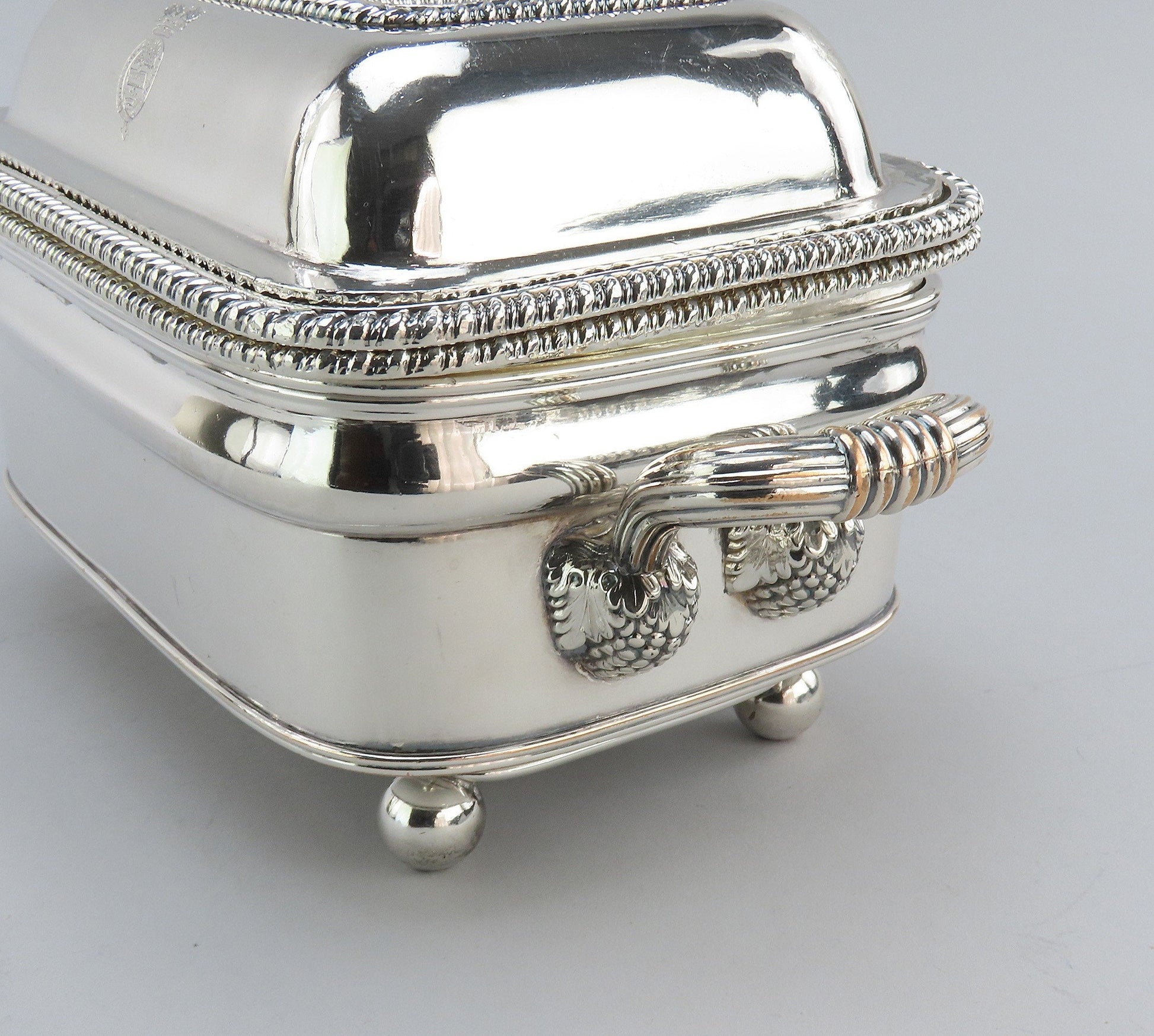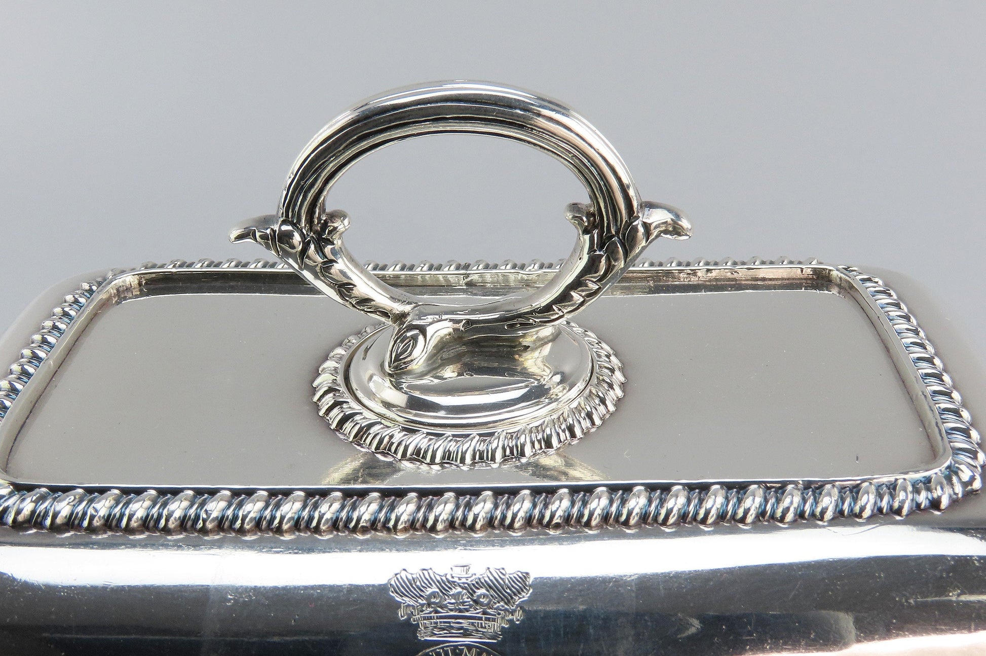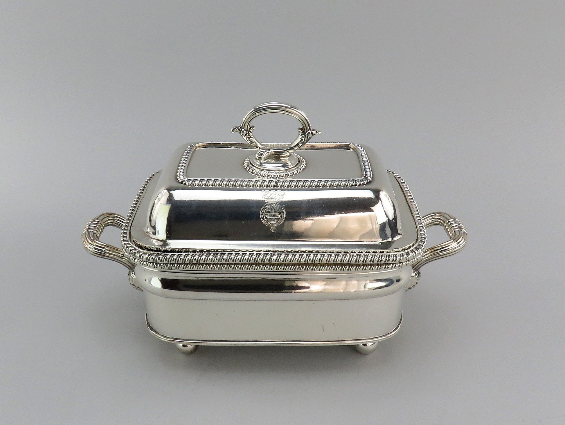 Presented is a lovely Old Sheffield Plate food warmer serving dish made between 1800 to 1830s. The piece displays a fancy gadroon edge on each section. The handles have a nice threaded detail and grape clusters where they meet the body. The warmer separates into three sections: one for hot or cold water, for heating or cooling, one for the actual food being served, and a lid on top. On either side of the lid, there is a sterling insert which displays a crest. Crest information: The center of the crest displays the heraldry for the Hamilton clan: an oak tree with the motto “Through”. Around the tree is the mark for the Order of the Garter, reading “Honi soit qui mal y pense" meaning “shame on anyone who thinks evil of it”. Due to the likely time period, we believe this piece belonged to Alexander Hamilton, the 10th Duke of Hamilton. The 10th Duke of Hamilton, is listed as a member of the Order of the Garter during the Reign of King William IV. The Duke of Hamilton held the position of Lord Lieutenant of Lanarkshire from 1802 to1852. The crown above the crest is likely the Scottish royal crown. This piece is from the estate of Florence Adele Vanderbilt Twombly, the granddaughter of Cornelius Vanderbilt.