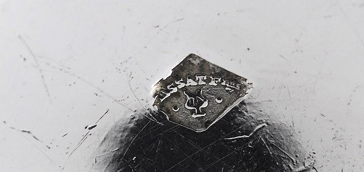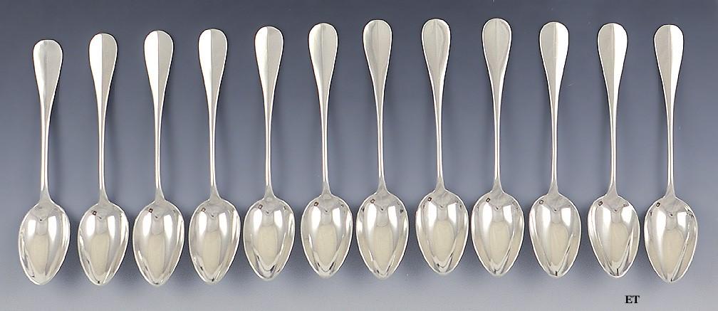 Each of the eleven silver spoons is hallmarked on the bowl with the French Minerva stamp for first standard silver, which has a purity of 950, as well as the maker's mark for Massat Frères. The bonus silverplate spoon is stamped 15g and with a maker's mark we unfortunately do not recognize.
