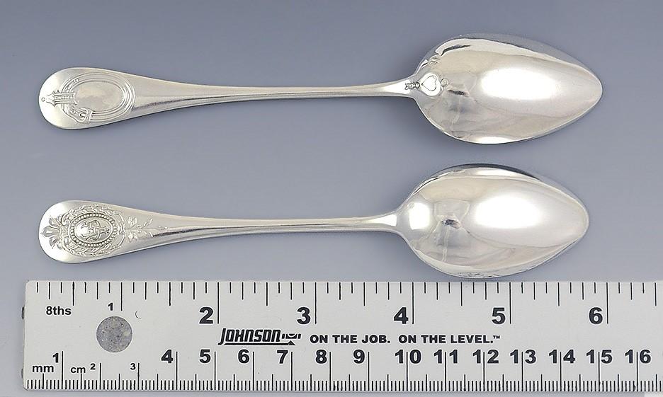 The spoons are in great overall condition. All eleven of the silver spoons have a professionally done monogram removal to the center of the belt cartouche on the back of the handles. These removals are hard to notice without close inspection. There are no breaks and no repairs.
