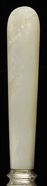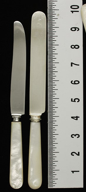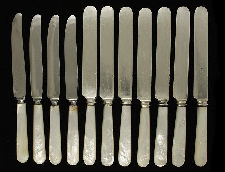 The condition is excellent. Four of the knives have replacement stainless steel blades, and one of these knives has a crack on the mother of pearl handle, but these knives are still structurally sound and useable. The blades on the other seven knives have some wear to the silver plating on the high points, but this is fairly minor. There are no other cracks, no chips, no splits, no breaks, and no repairs.
