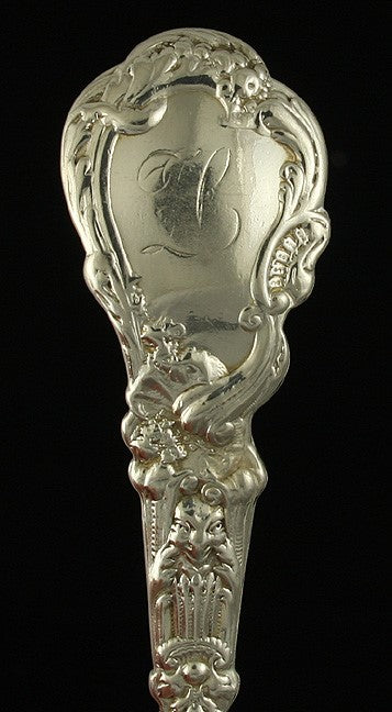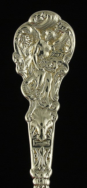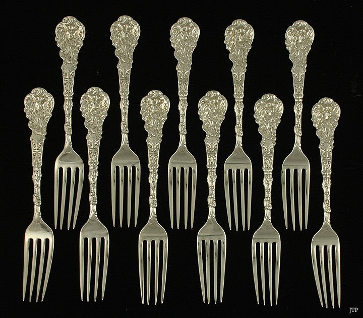 Presented is a fine quality set of 11 sterling silver forks made by Gorham. This set is in the multi-motif Versailles pattern, which was patented in 1888. The top of each handle has a chased design of an angel holding a basket of fruit and the rest of the handle is elaborately decorated with leaf, scroll and shell embellishments. The back of each handle has an old monogram of what appears to be the initials ZC. The pieces in this set are very thick and heavy solid sterling silver.