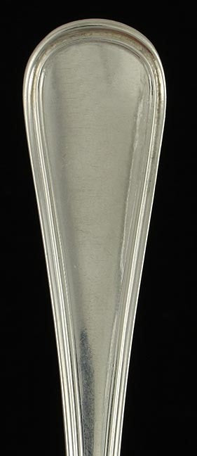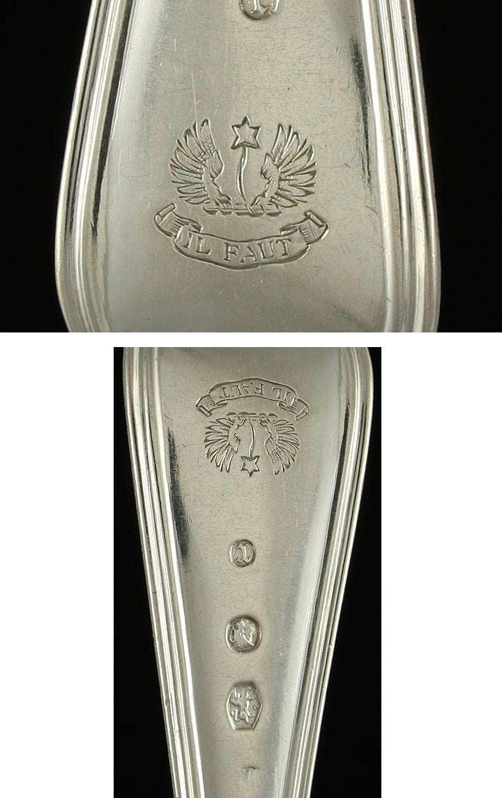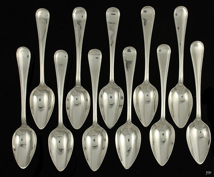 Presented is a wonderful quality, heavy weight set of 11 Dutch silver dessert spoons or soup spoons made by J. M. Van Kempen & Son. These spoons are the large continental European size. They are done in an elegant threaded pattern which will work well with a variety of other patterns or sets. The backs of the handles are engraved with a star with wings on either side and the French motto ‘Il Faut’ beneath. The spoons are very well made and have great weight.