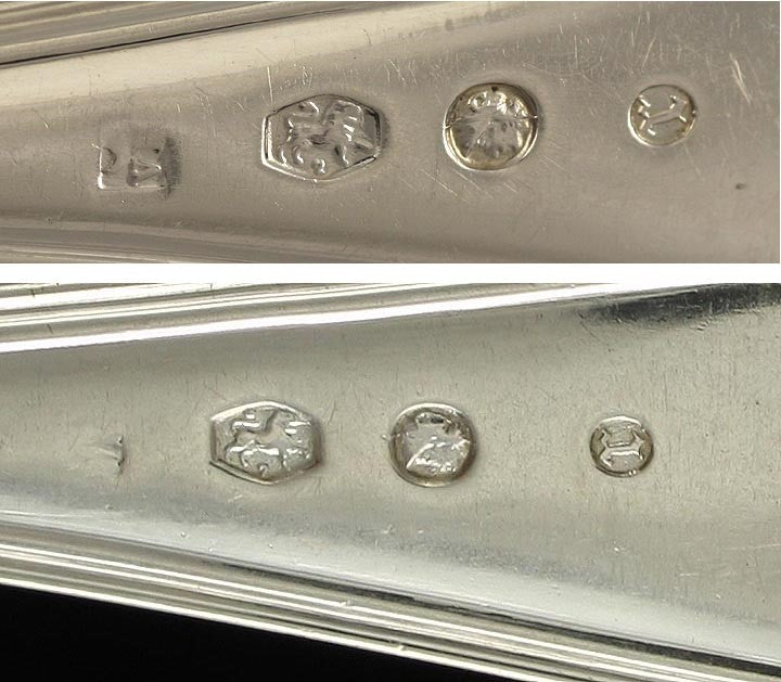 Each spoon is hallmarked on the reverse with the lion mark for Dutch 833 purity silver, the Minerva’s head duty mark, the maker’s mark for J. M. Van Kempen & Son, and a year mark. Four spoons have an ‘h’ year mark for 1867 and seven spoons have an ‘r’ year mark for 1876.