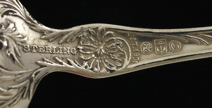 The spoons are marked on the reverse with Gorham’s old company hallmarks, Sterling, and Pat. 1901.
