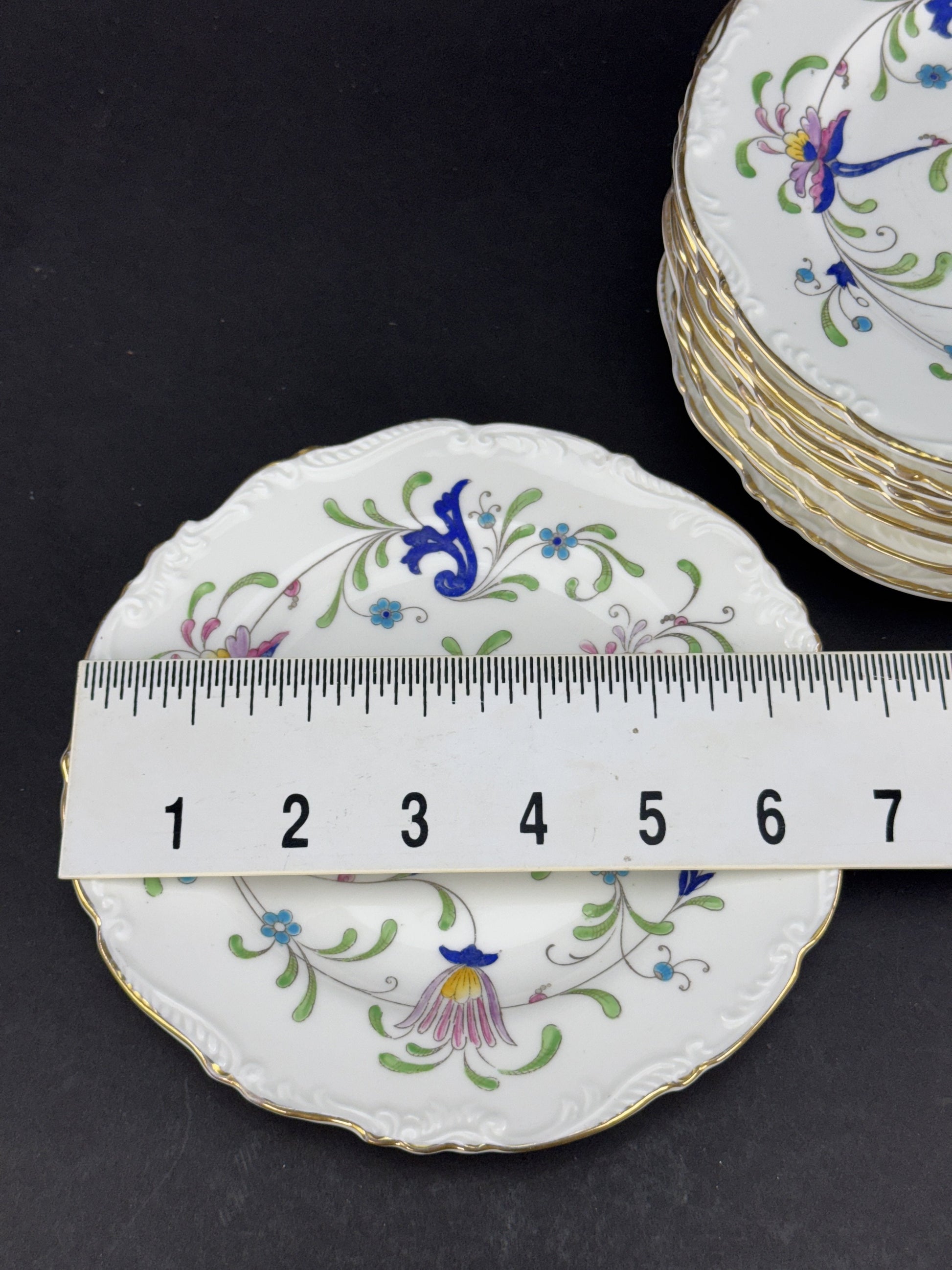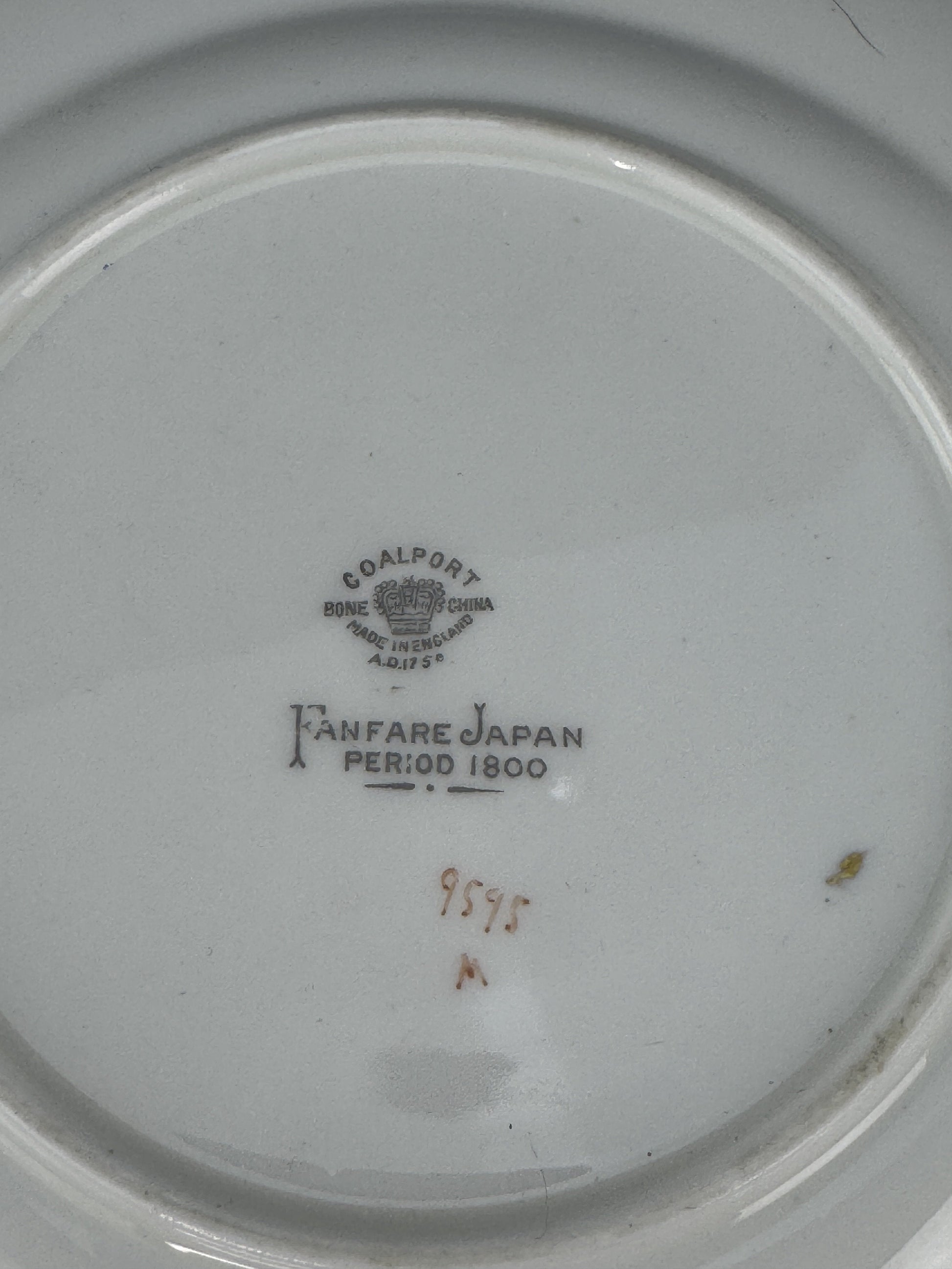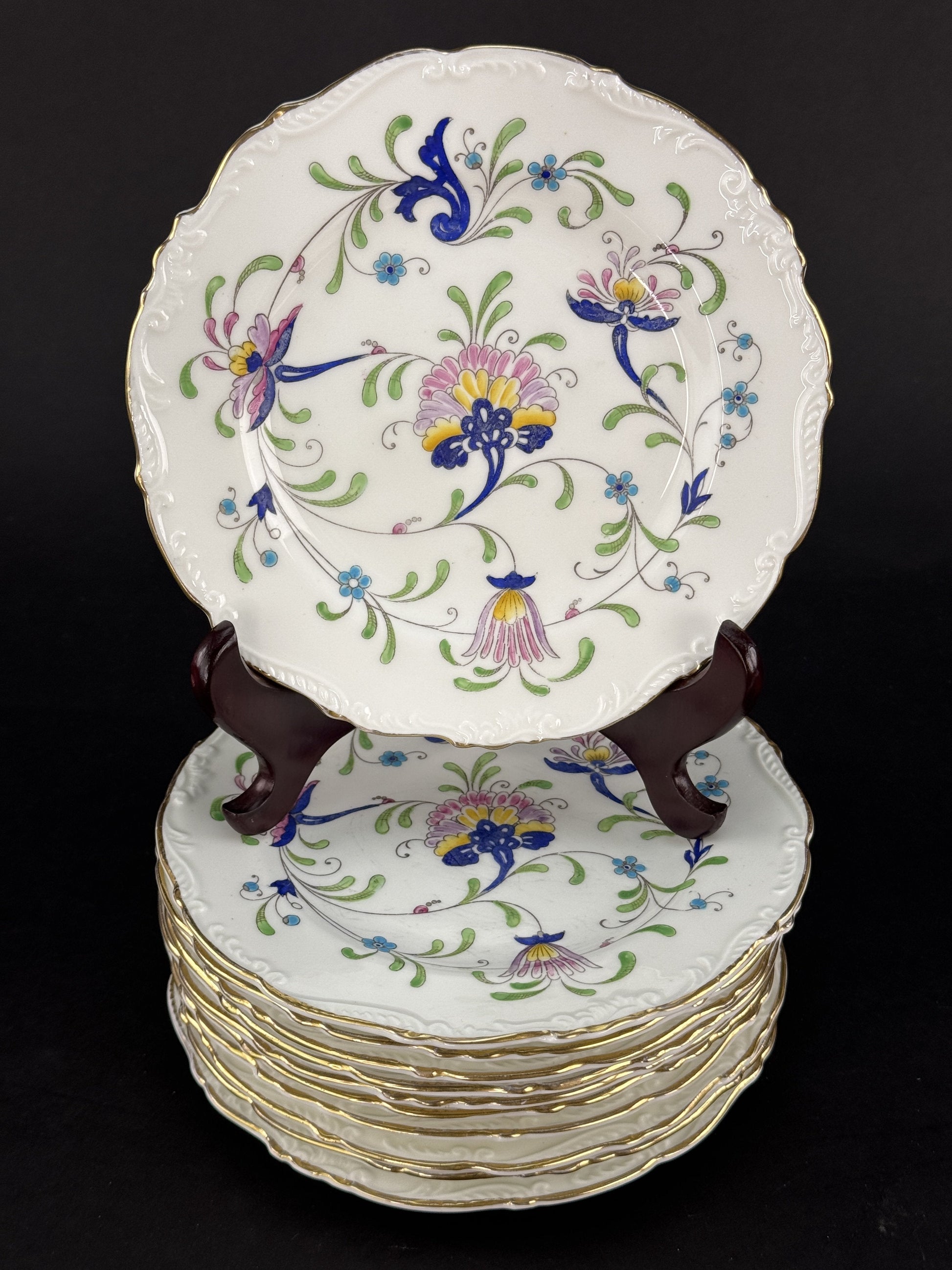 Presented is a fine quality set of 11 bread and butter plates in the Fanfare Japan pattern by Coalport. These are very attractive plates with raised enamel painted decoration. These plates were probably made between 1940 to 1973.