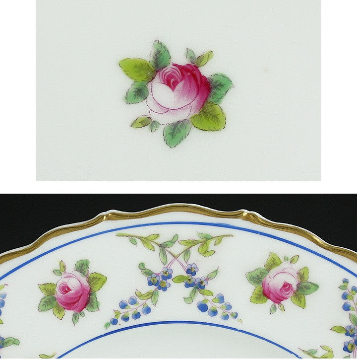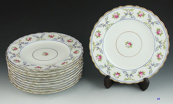 Presented is a beautiful set of 11 English porcelain luncheon-sized plates made by Coalport for retail by Shreve, Crump & Low. Each plate has a ruffled, gilt edge and a decorative rim painted with pink roses and small blue flowers. The center of each plate has a nice pink rose detail and a circle of gilt design.
