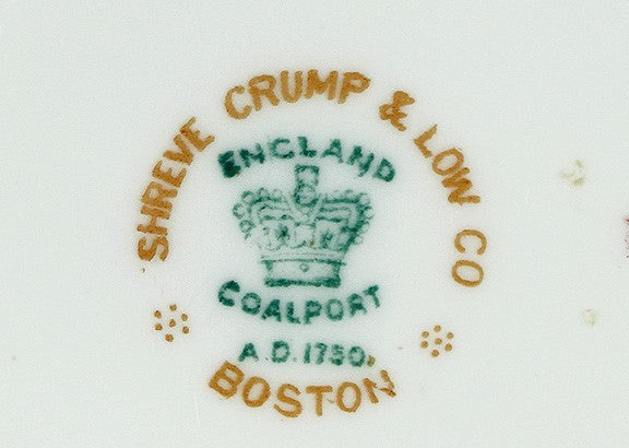 The underside of each plate bears the Coalport of England hallmark that was used 1891-1920 and a retailer’s mark for Shreve, Crump & Low. This set is in great overall condition.