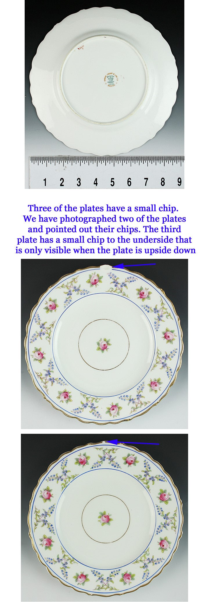 Two of the plates have a small chip and one plate has a larger chip , we have pointed two of the plates out in the last two photographs below, the third plate has a small chip to the underside that is only visible when the plate is turned upside down. There is some minimal wear to the paint and gilding but is minor. There are no other chips, no cracks, no breaks, on splits and no repairs.