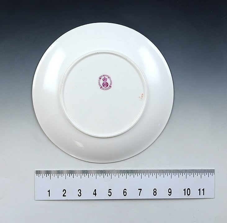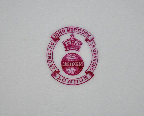 The underside of each plate bears the Minton’s mark used between 1873 and 1912. There is a series of three impressed marks on the underside of each plate, one of which (the circle within the triangle) is a date mark for the year 1878.There is also a retailer’s mark for John Mortlock of London.