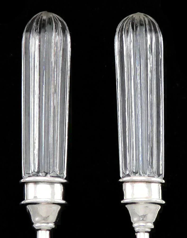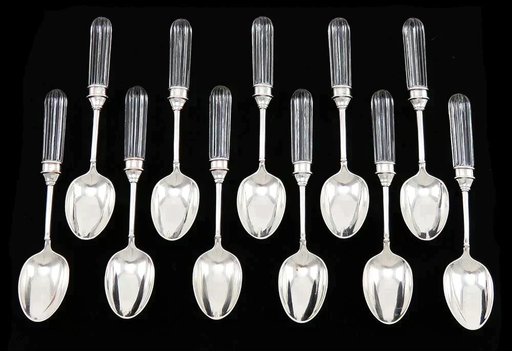 Presented is a fine set of 11 crystal and silver-plated tea, coffee or dessert spoons made by Siecle of Paris. This set is in the Fidelio pattern. Each handle is crystal and done in a ridged form. The collars and blades are silverplate.