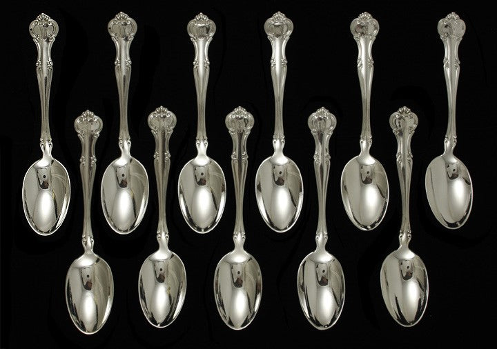 Presented is a fine set of 11 sterling silver teaspoons made by Gorham Manufacturing Company. The spoons are done in the Cromwell pattern which was first produced in 1900. The spoons are all monogrammed with a B in an elegant script.