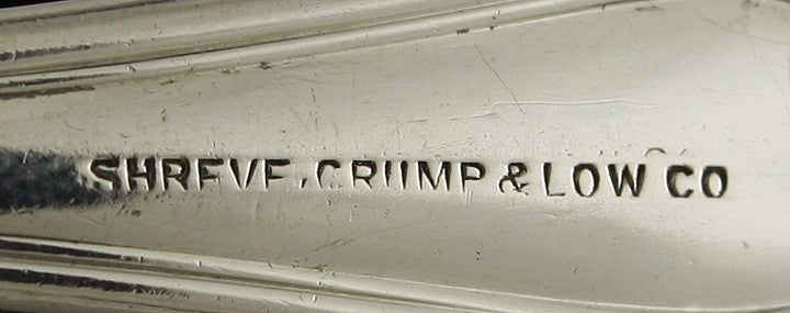 The spoons are hallmarked on the reverse with Gorham’s old company hallmarks, Sterling, Patent, and Shreve, Crump & Low Co for the retailer.