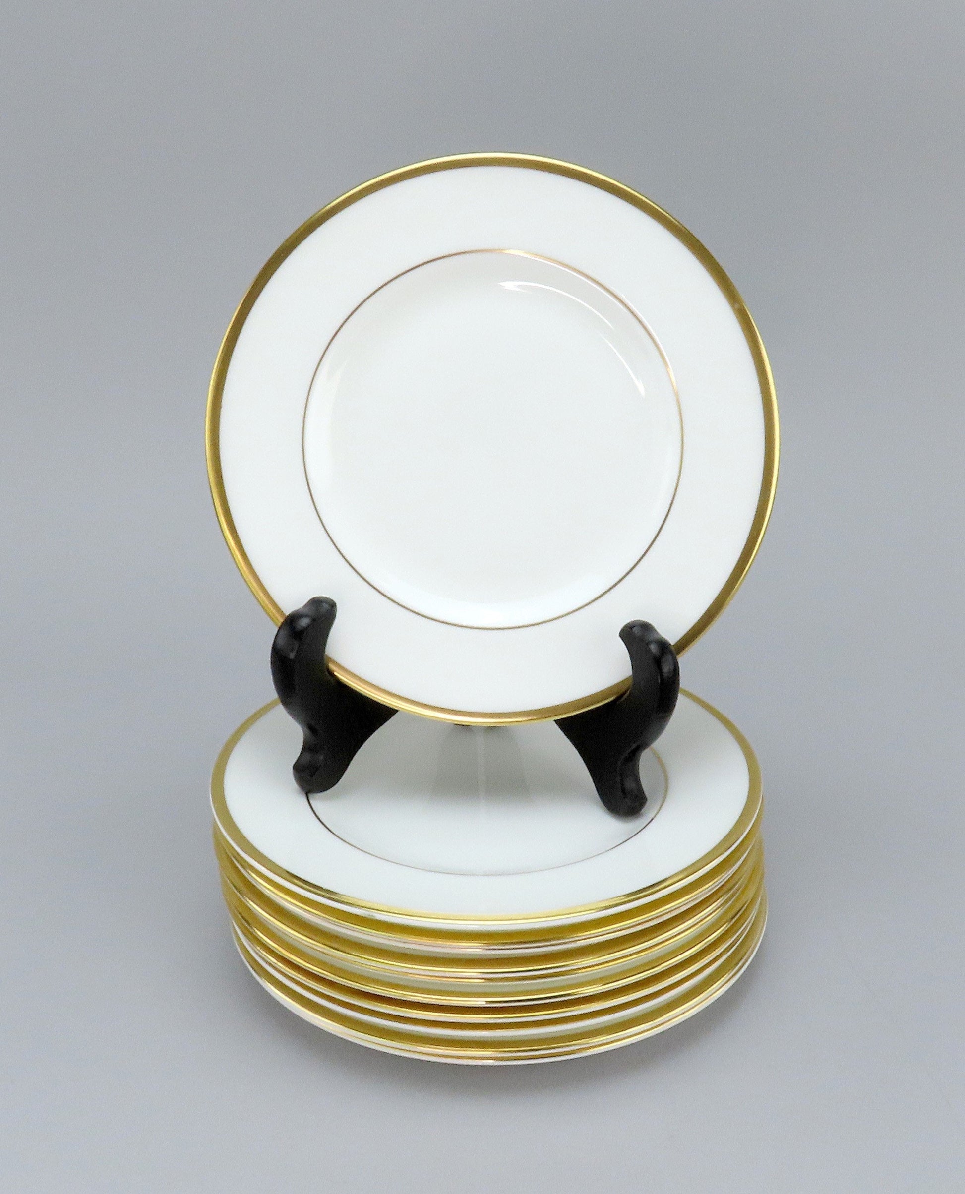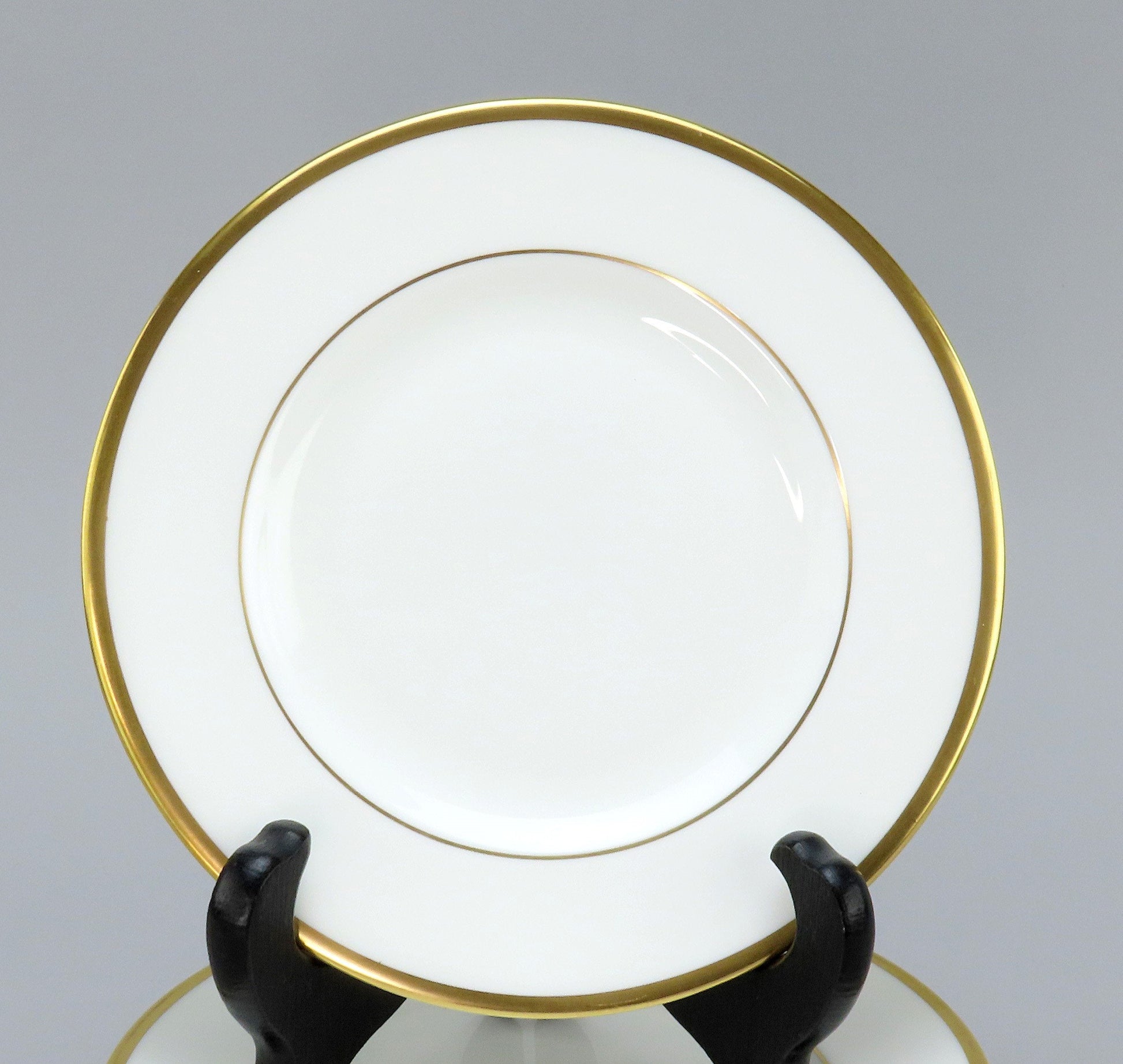 Presented is a set of 11 English bone china bread and butter plates from Wedgwood. This set is in the California pattern, which was in production from 1963-2005 and displays a classic wedding band style. The plates have a pure white color and two gilded bands, one around the rim. Please note, we have additional sets of plates in varying sizes in this pattern, which you can find by searching "California" in our store.