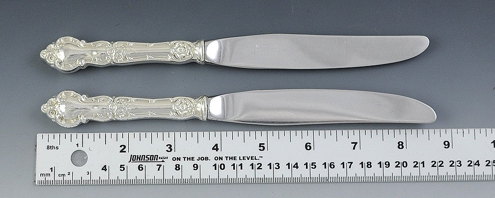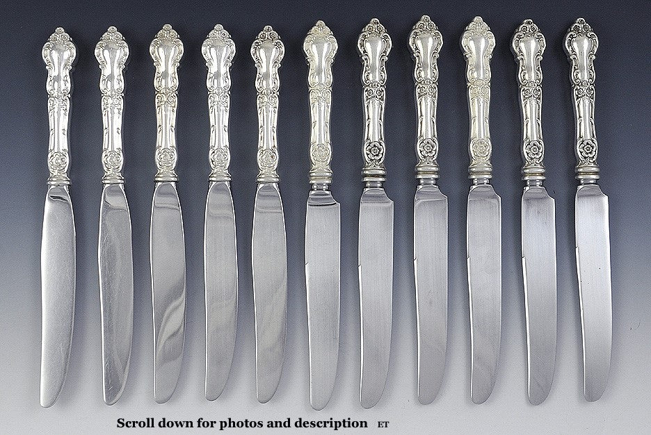 Presented is a fine quality set of 11 sterling silver handled knives by Watson Silver. These knives are made in the lovely Meadow Rose pattern, which dates to 1907. As the name suggests, the handles of the knives have a floral motif. The blades of five of the knives are done in the modern style, while the remaining six have New French style blades. All the blades are stainless steel. The five knives with modern style blades are monogrammed with 'sKt' on the handles. These are luncheon size knives.