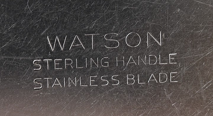 The knives are hallmarked on the side of the handles with the stamp for Watson and 'STERLING HDL'. The blades are also marked 'Watson sterling handle stainless blade'.