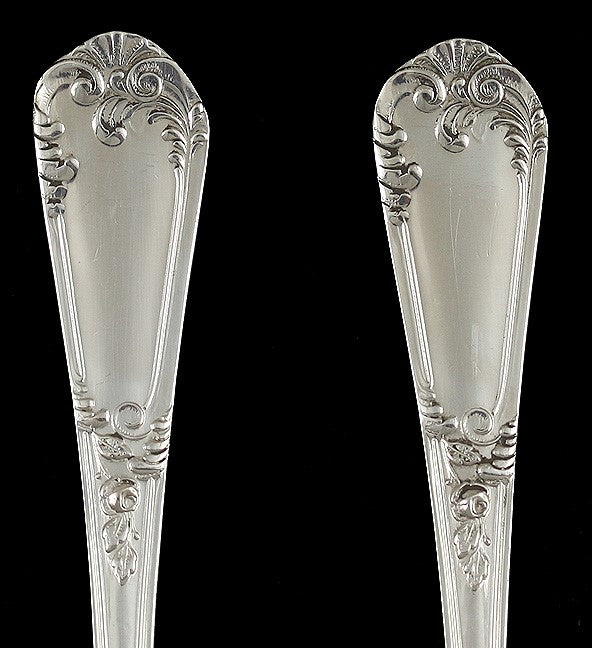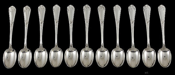 Presented is an elegant set of 11 Italian silver demitasse spoons. The spoons are done in a classic pattern with scrolls and flourishes on the sides of the handle and a shell design at the tip. The spoons have never been monogrammed or engraved.