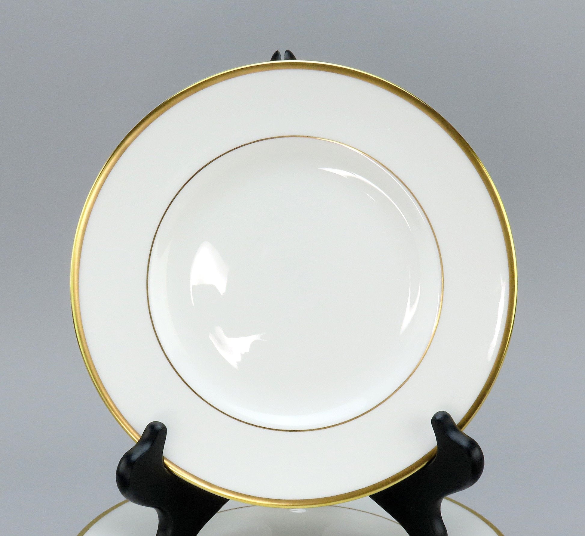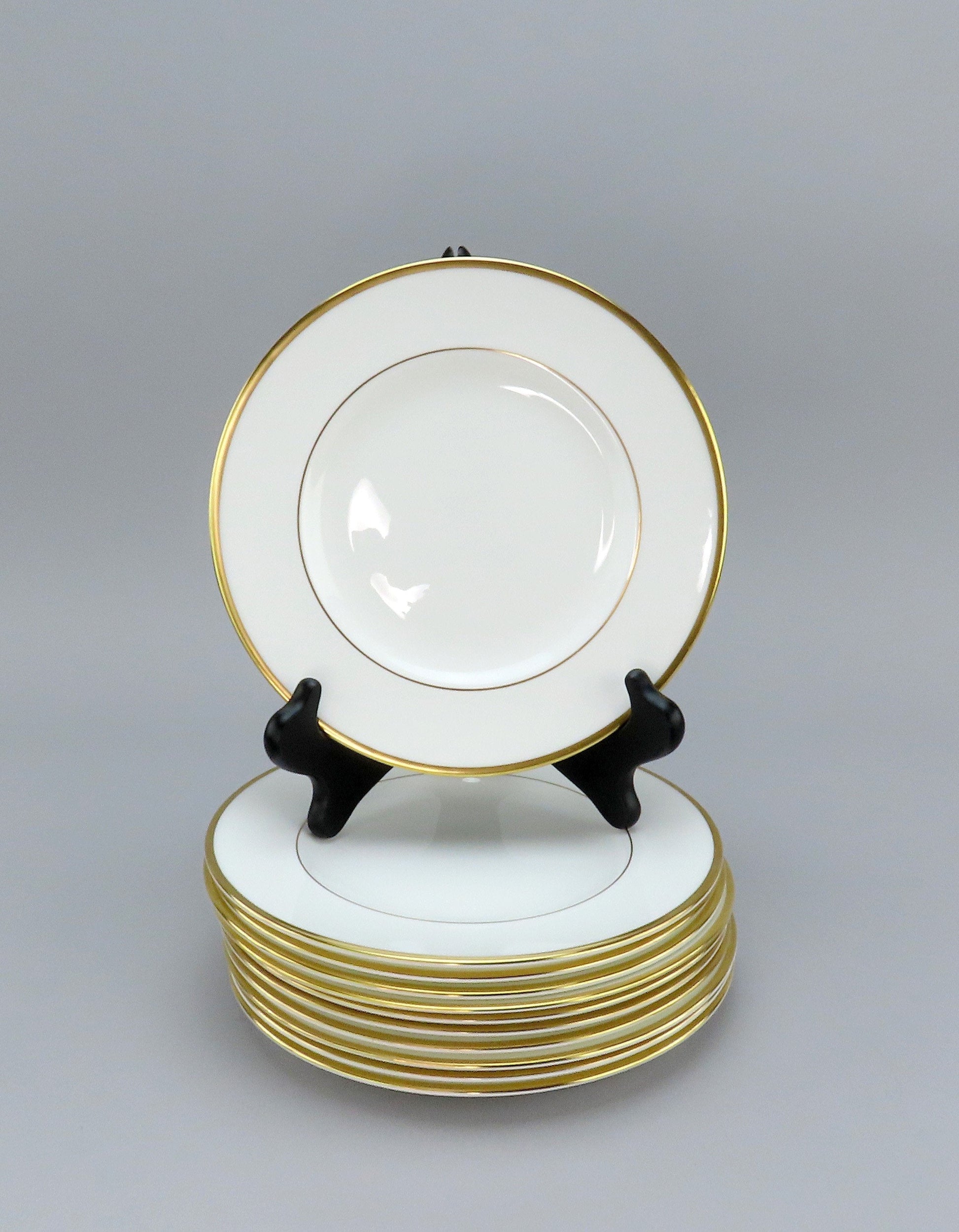 Presented is a set of 11 English bone china salad plates from Wedgwood. This set is in the California pattern, which was in production from 1963-2005 and displays a classic wedding band style. The plates have a pure white color and two gilded bands, one around the rim. Please note, we have additional sets of plates in varying sizes in this pattern, which you can find by searching "California" in our store.