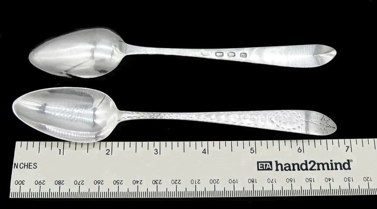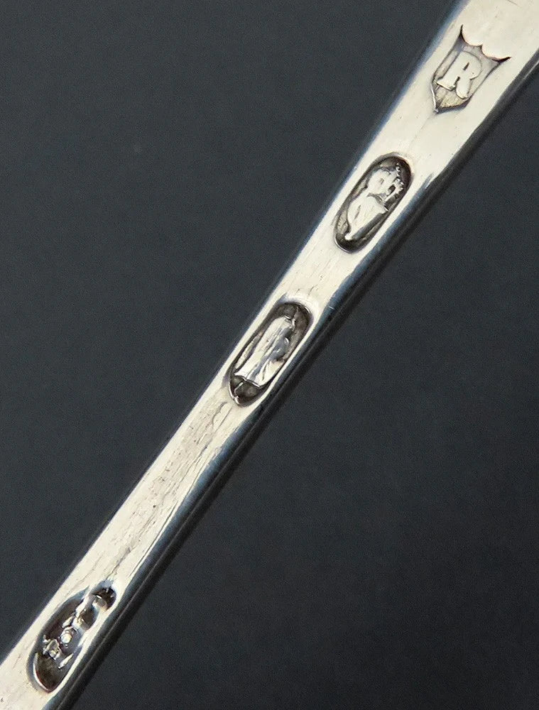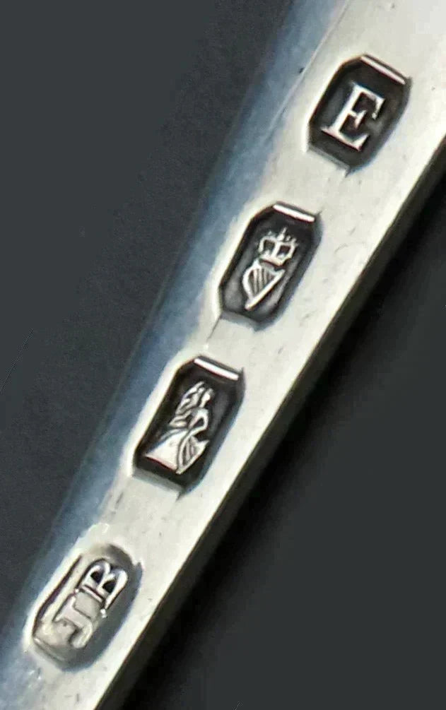 All of the spoons bear the crowned harp for the city of Dublin and the Hibernia mark for sterling silver purity. 11 of the spoons bear a date letter E for the year 1801 and a maker's mark of the initials JB. One spoon bears a date letter R for the year 1789 and has a worn maker's mark.
