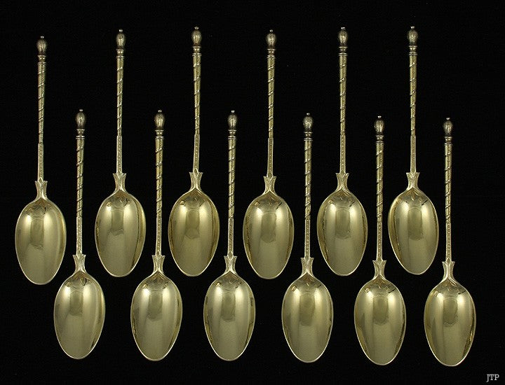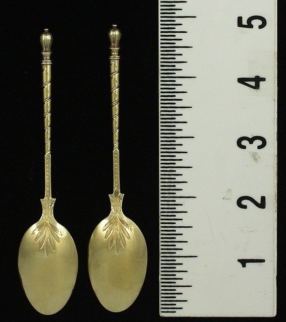 Presented is a marvelous set of 12 French silver demitasse spoons made by Joseph Adoue during the 1850s. These spoons are French 1st standard .950 purity silver, which is actually higher than .925 sterling purity. The spoons are heavy for their size and are completely guilt with a rich gold wash. Each handle is done in a twist form with a decorative finial. Each handle is hand engraved with details along the twisting form. The back of each bowl is beautifully engraved with bright-cut leaves.