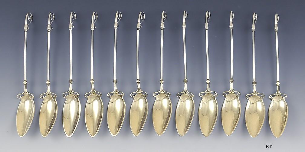 Presented is a fine set of 12 Gorham sterling silver spoons. These spoons are done in the American Aesthetic Movement style, and date to that time period as well. The bowls of the spoons have an elliptical, leaf-like shape with a gold wash. Above the bowls and at the ends of the handles are spiral vine or tendril designs. Use these charming spoons for teaspoons, dessert spoons, or however else you like.