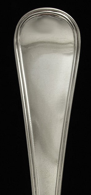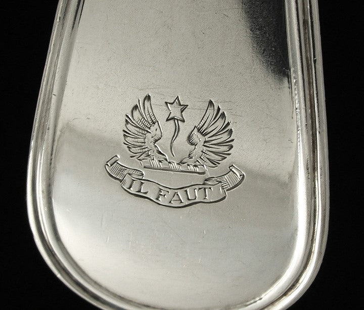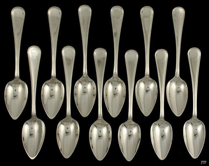 Presented is a wonderful quality, heavy weight set of 12 Dutch silver soup spoons, place spoons, or dessert spoons made by J. M. Van Kempen & Son. These spoons are the huge continental European size. They are done in a classic threaded pattern which will work well with a variety of other patterns or sets. The backs of the handles are engraved with a star with wings on either side and the French motto ‘Il Faut’ beneath. This complete set of 12 spoons is very well made and have great weight.