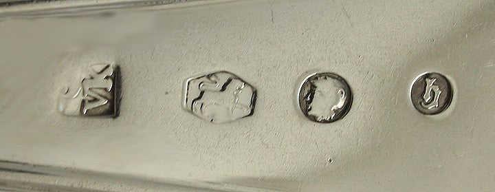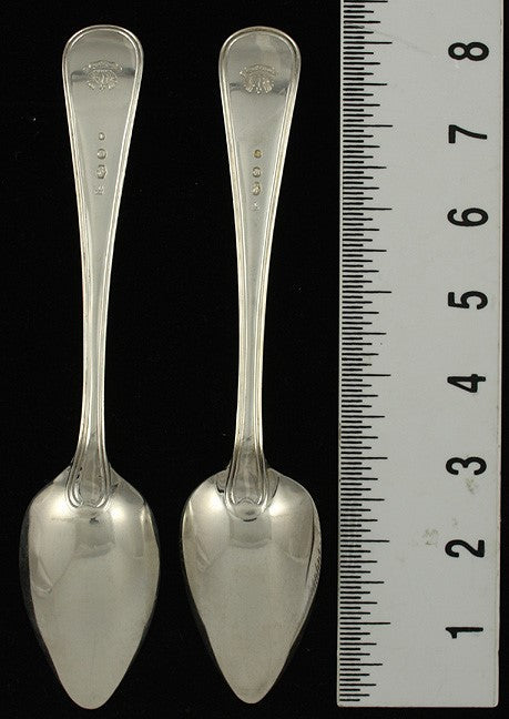 Each spoon is hallmarked on the reverse with the lion mark for Dutch 833 purity silver, the Minerva’s head duty mark, the maker’s mark for J. M. Van Kempen & Son, and a year mark. Four spoons have an ‘h’ year mark for 1867, one spoon has an ‘i’ for 1868, and seven spoons have a ‘p’ for 1874.