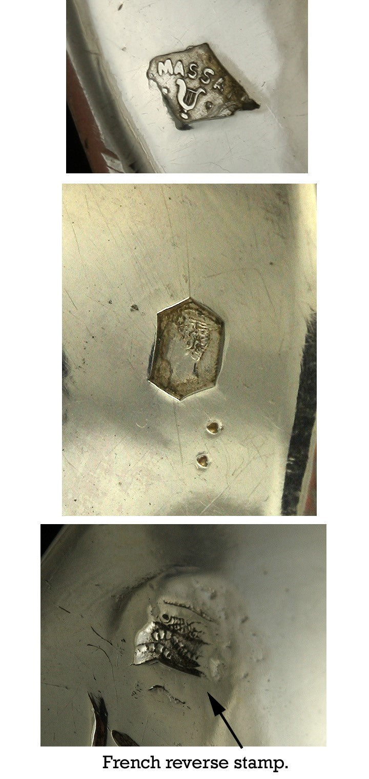 Each spoon is stamped on the bowl with the Mercury hallmark for French first standard 950 purity silver and a maker’s mark for Massat Freres. These spoons were probably made in the last quarter of the 1800s, almost certainly more than 100 years old.