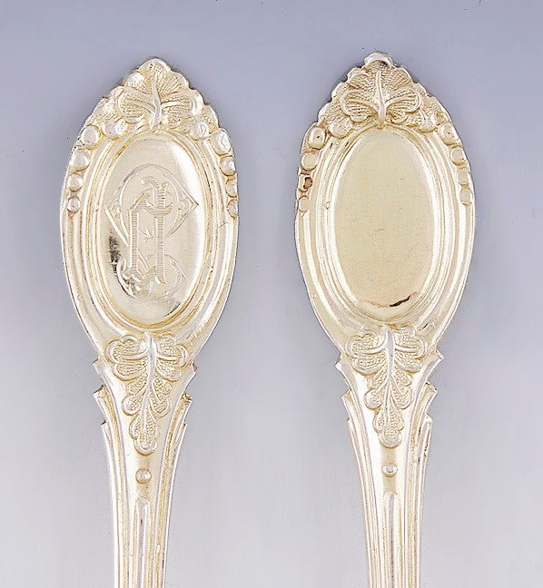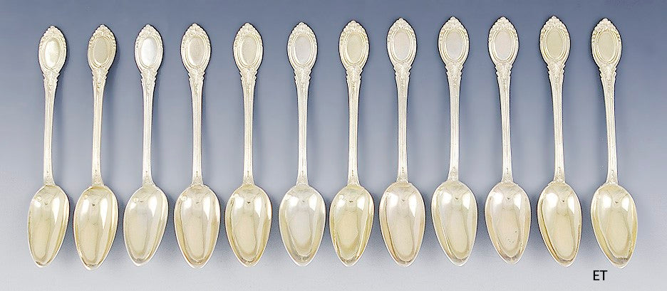 Presented is a great set of 12 French silver coffee or tea spoons. These spoons date to the late 1800s or early 1900s. The spoons are done in an elegant design, with foliate decorations on the handles and a gold wash. Each spoon is monogrammed PS in Gothic script, in an oval cartouche on the back of the handle. The oval cartouches on the fronts of the handles have no monograms.
