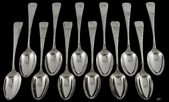 Presented is a great set of 12 sterling silver teaspoons made by Gorham Manufacturing Company. The spoons are done in the Carnation pattern which was first produced in 1894. The entire design on the front of each spoon is completely handed engraved. The backs of the handles are engraved with an H in Gothic script.