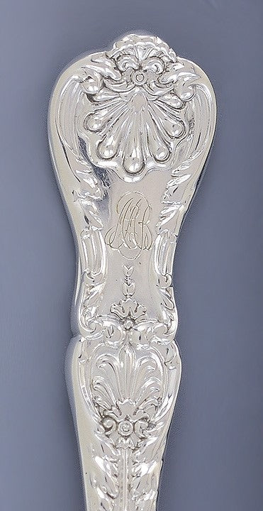 Presented is a fine quality set of 12 Gorham sterling silver cocktail or seafood forks. These forks are done in the classic King George pattern, which began production in 1894. This is an elegant pattern featuring shell and scroll designs on the front and back of the handles. Each fork has a small monogram of 'AAB' in flowing script on the handle.