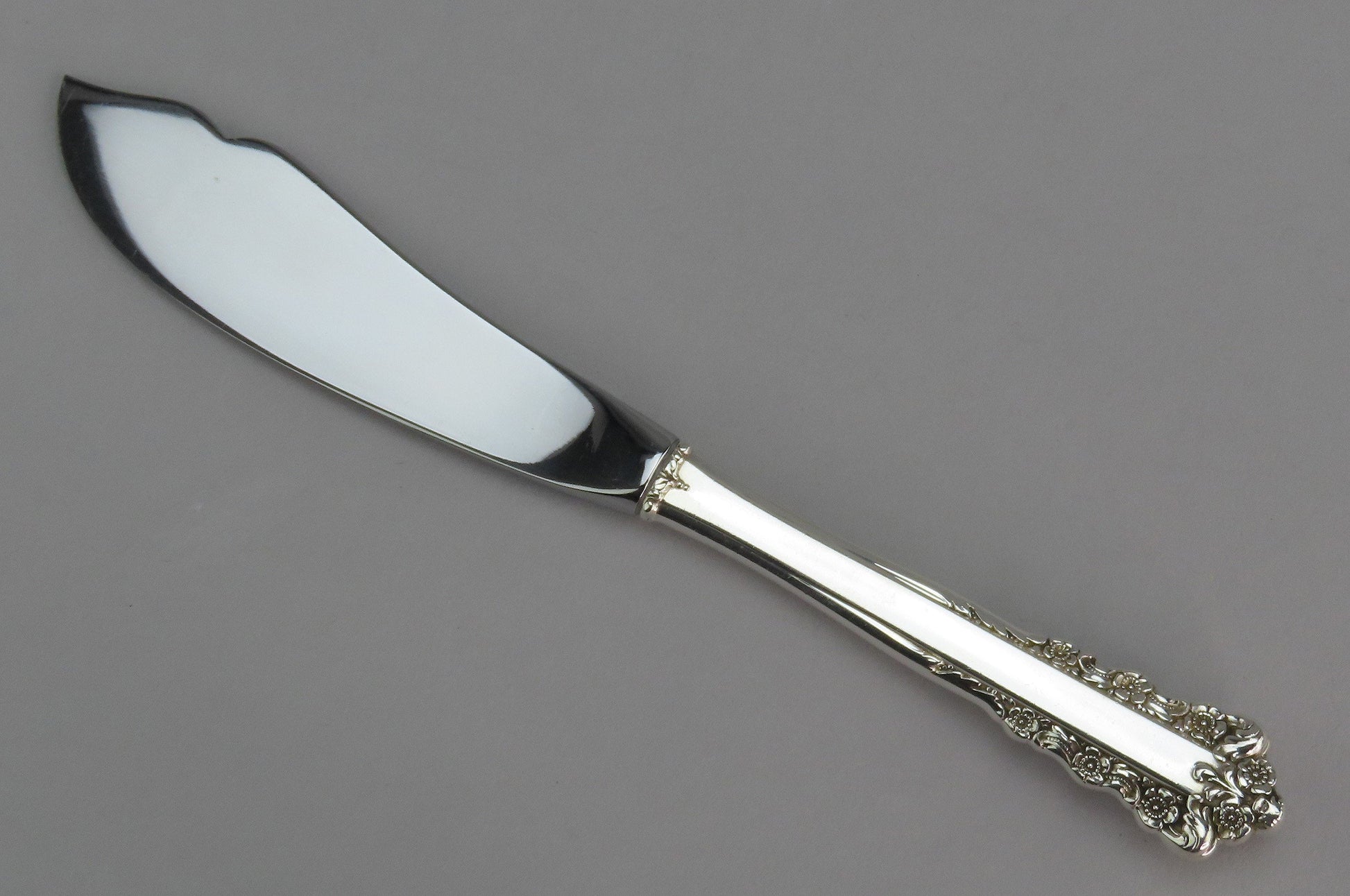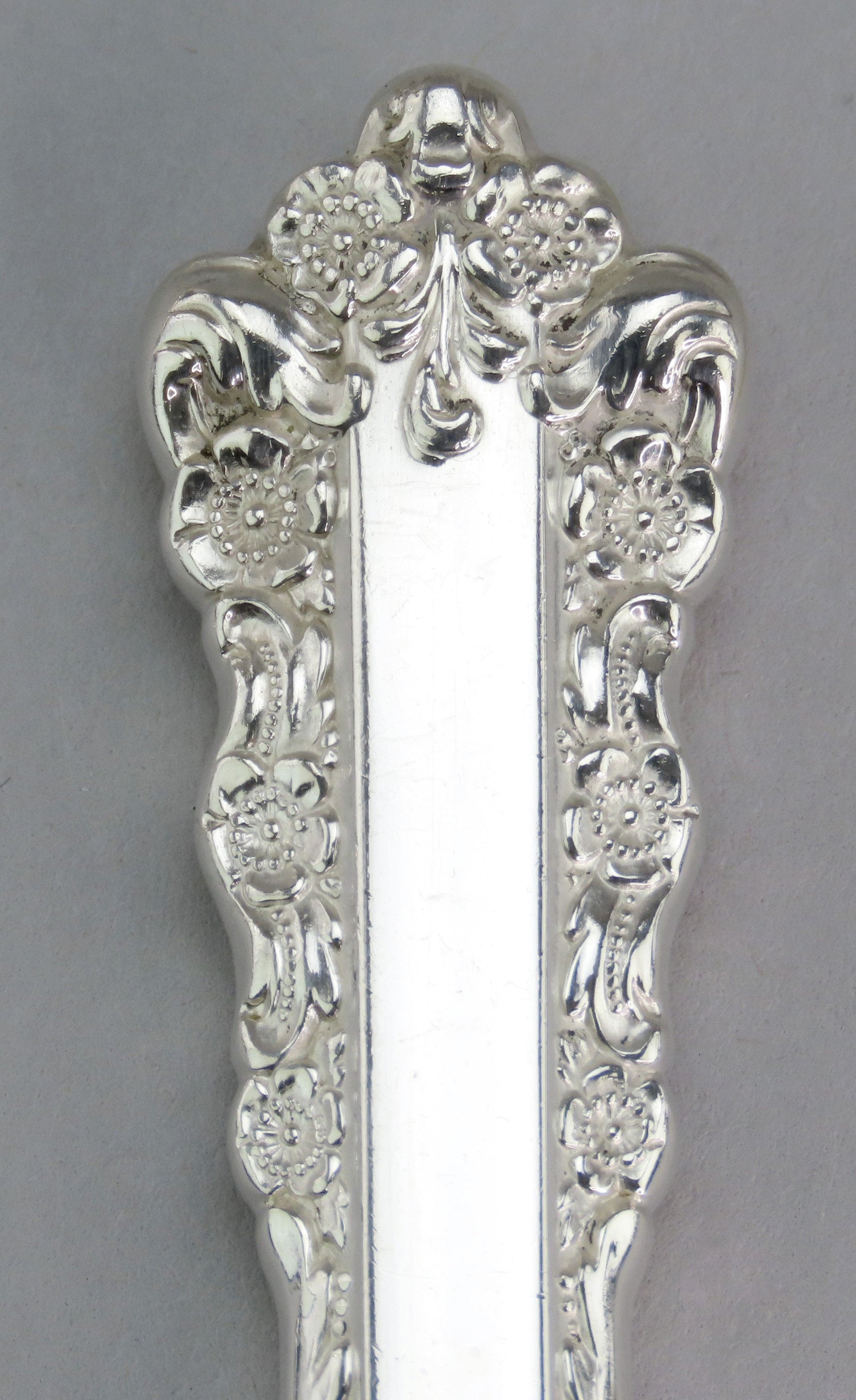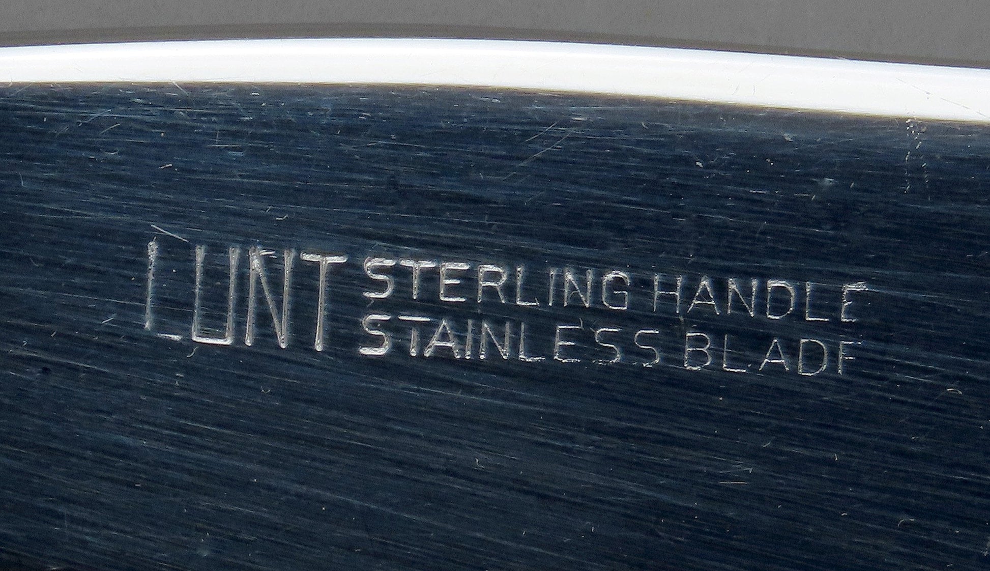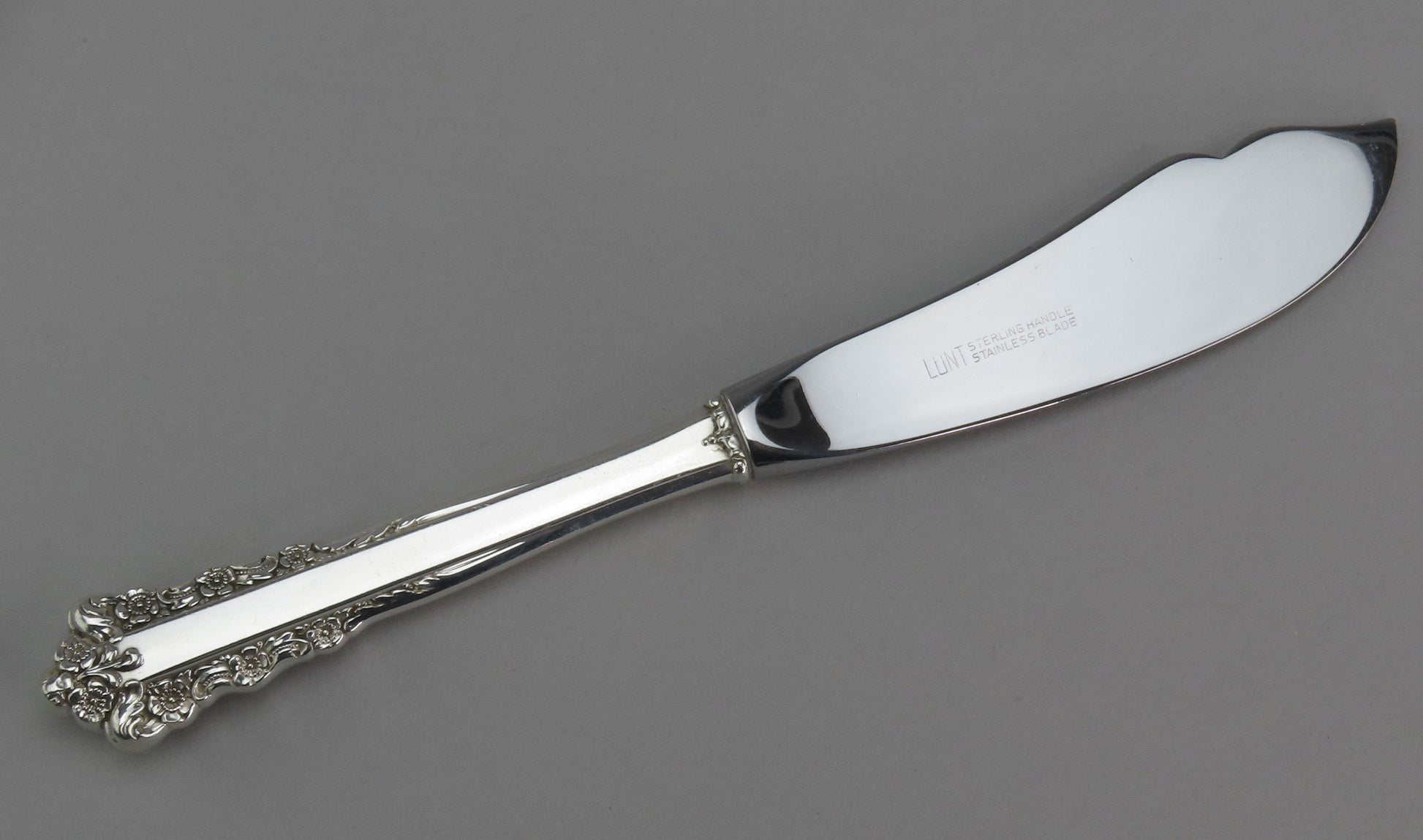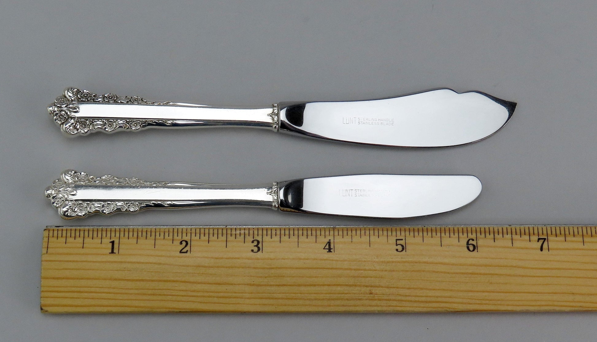 Presented is a wonderful set of 12 butter spreaders and 1 master butter knife from Lunt Silver. This set is in the Belle Meade pattern, which was patented in 1967. All the knives have sterling silver handles and stainless steel blades. The pattern displays fancy scrolls and flower on the handle ends. Each piece is marked on the blade with the “Sterling Handle/ Stainless Blade” and the mark for Lunt Silver. This set is in excellent overall condition. There are no monograms, no monogram removals. The blades and handles are securely attached. There are no breaks and no repairs. Length of butter spreader: 6 1/4 inches Length of master butter: 6 7/8 inches -kc