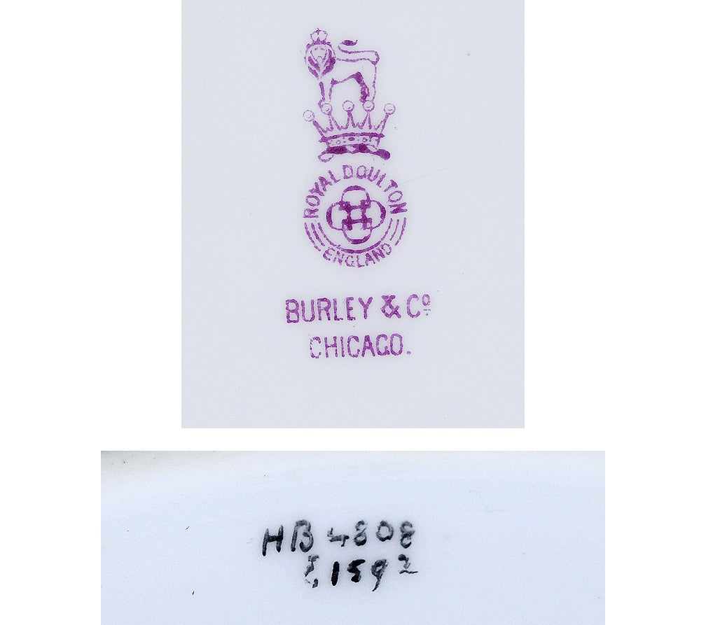 The undersides are marked with the Royal Doulton hallmarks used from 1923 to 1927 and a retailer’s mark for Burley & Company of Chicago.