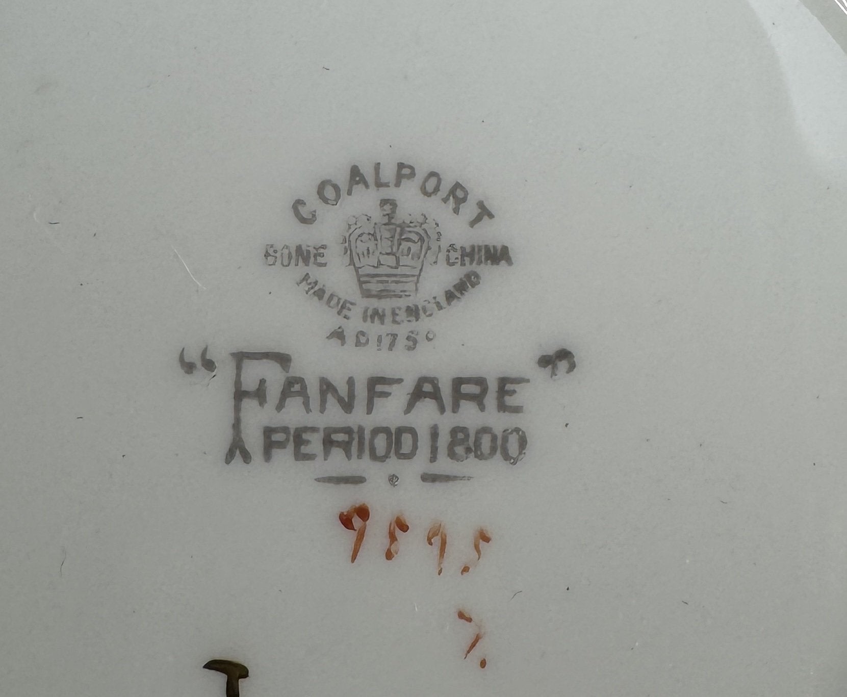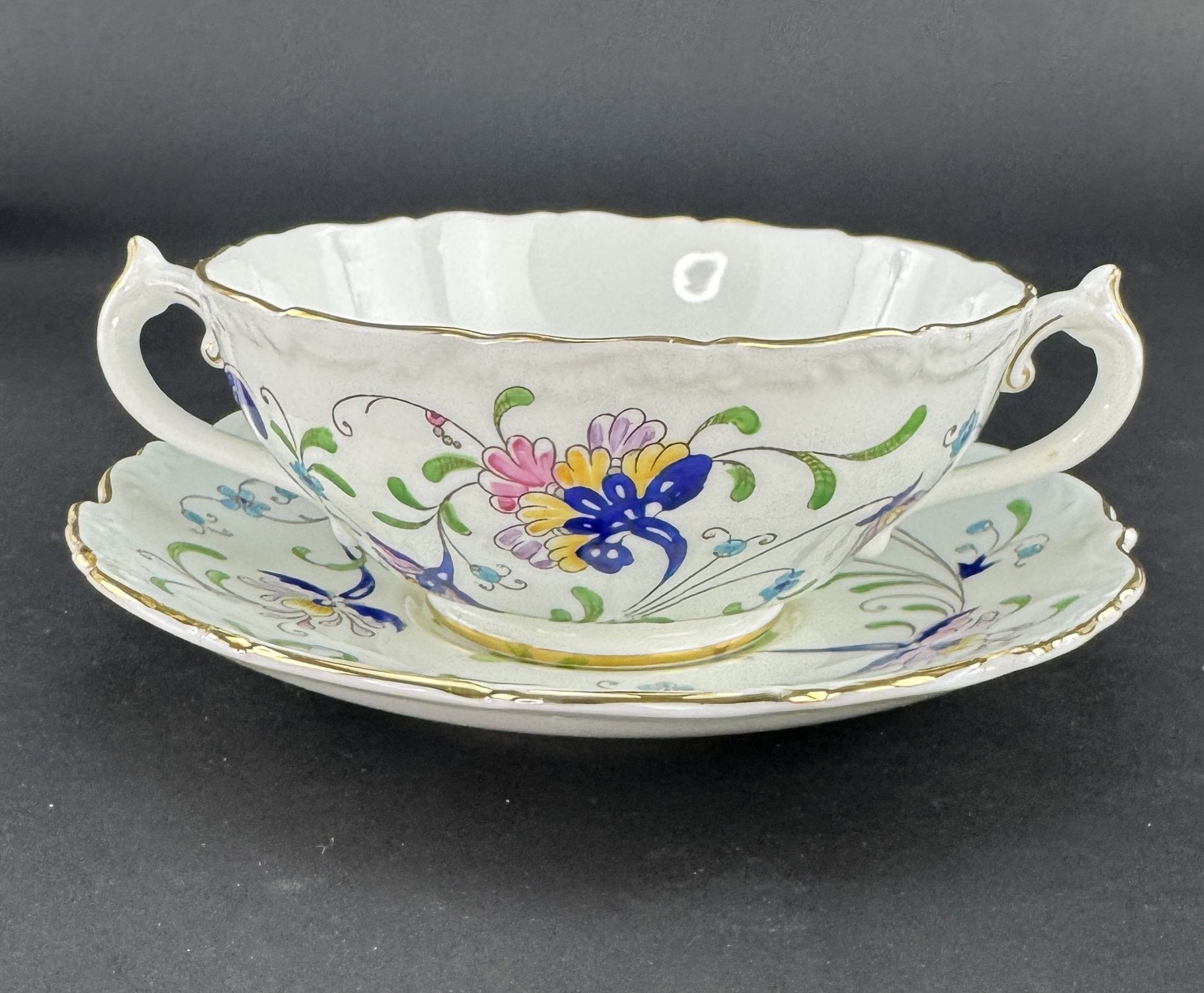 Presented is a fine quality set of 12 two handle bullion or cream soup bowls with under plates in the Fanfare Japan pattern by Coalport. These are very attractive plates with raised enamel painted decoration. These plates were probably made between 1940 to 1973.