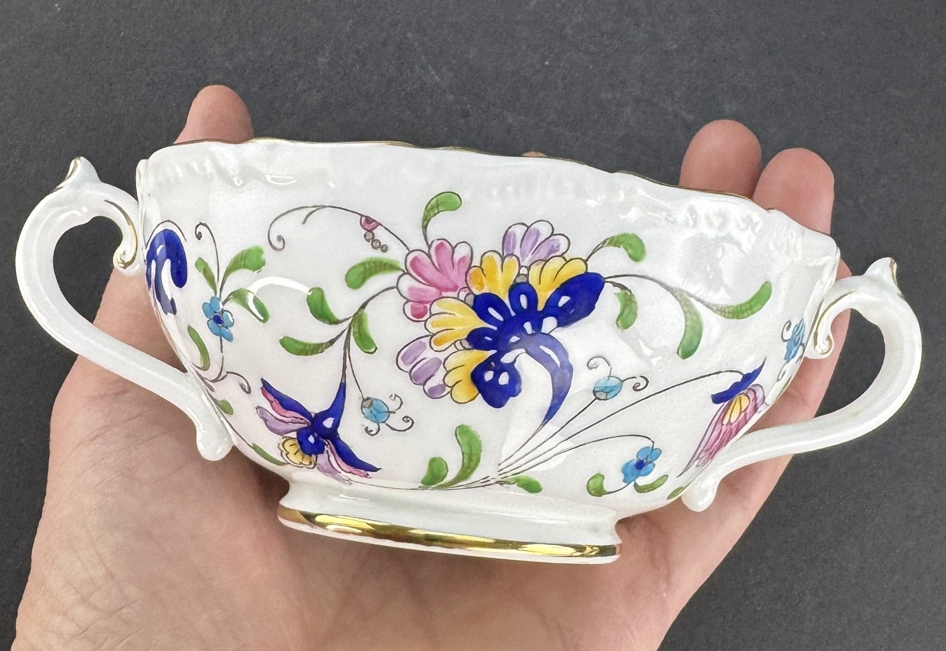 Both the two handled soup bowls and the plates are in excellent condition. There are no chips, no cracks and no repairs.