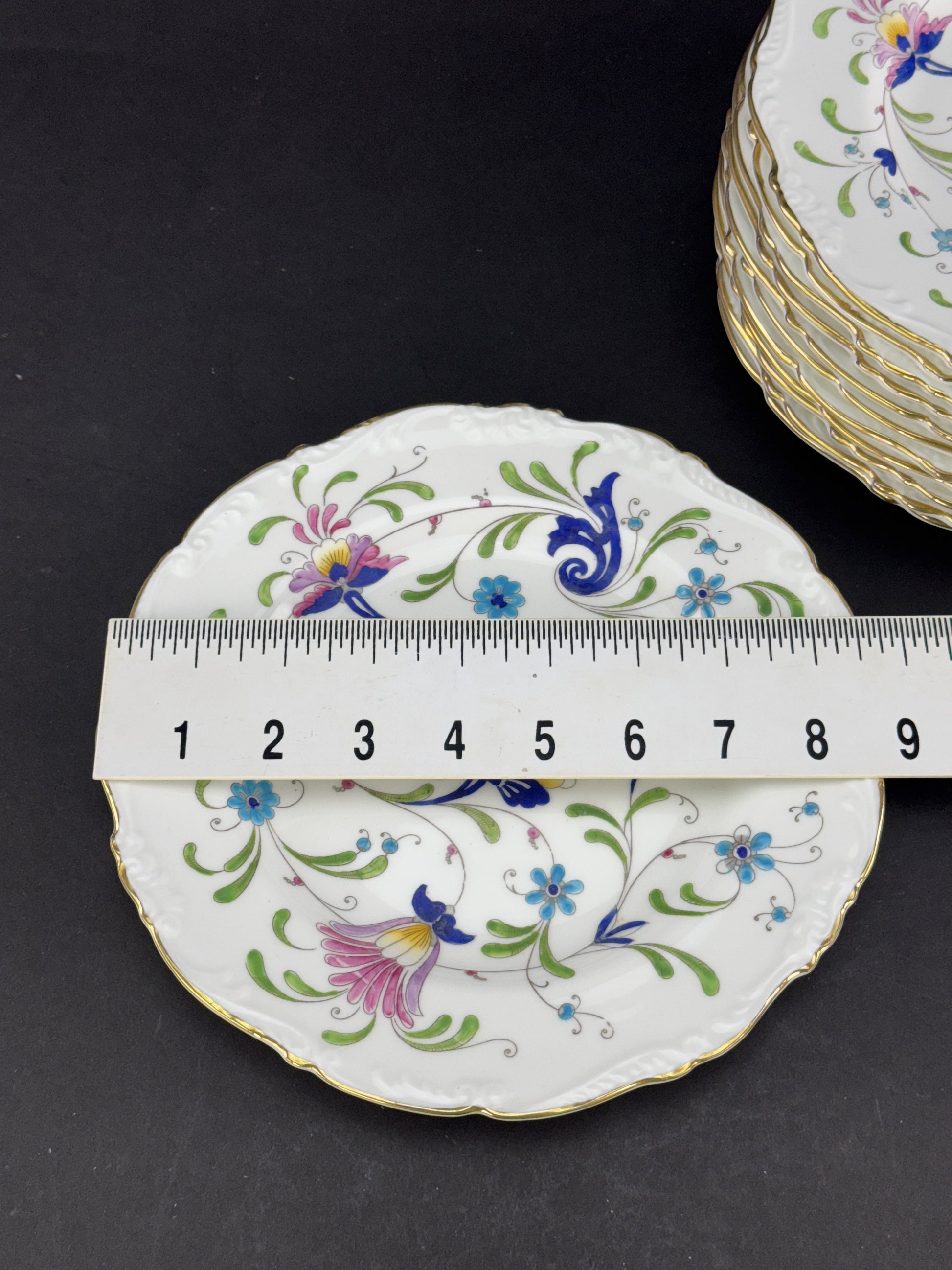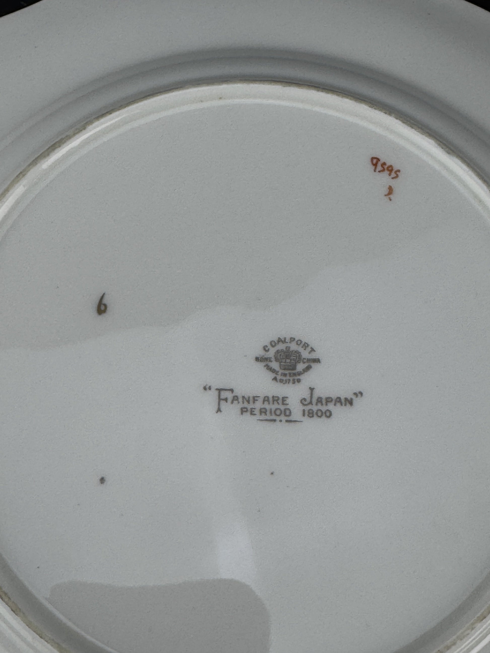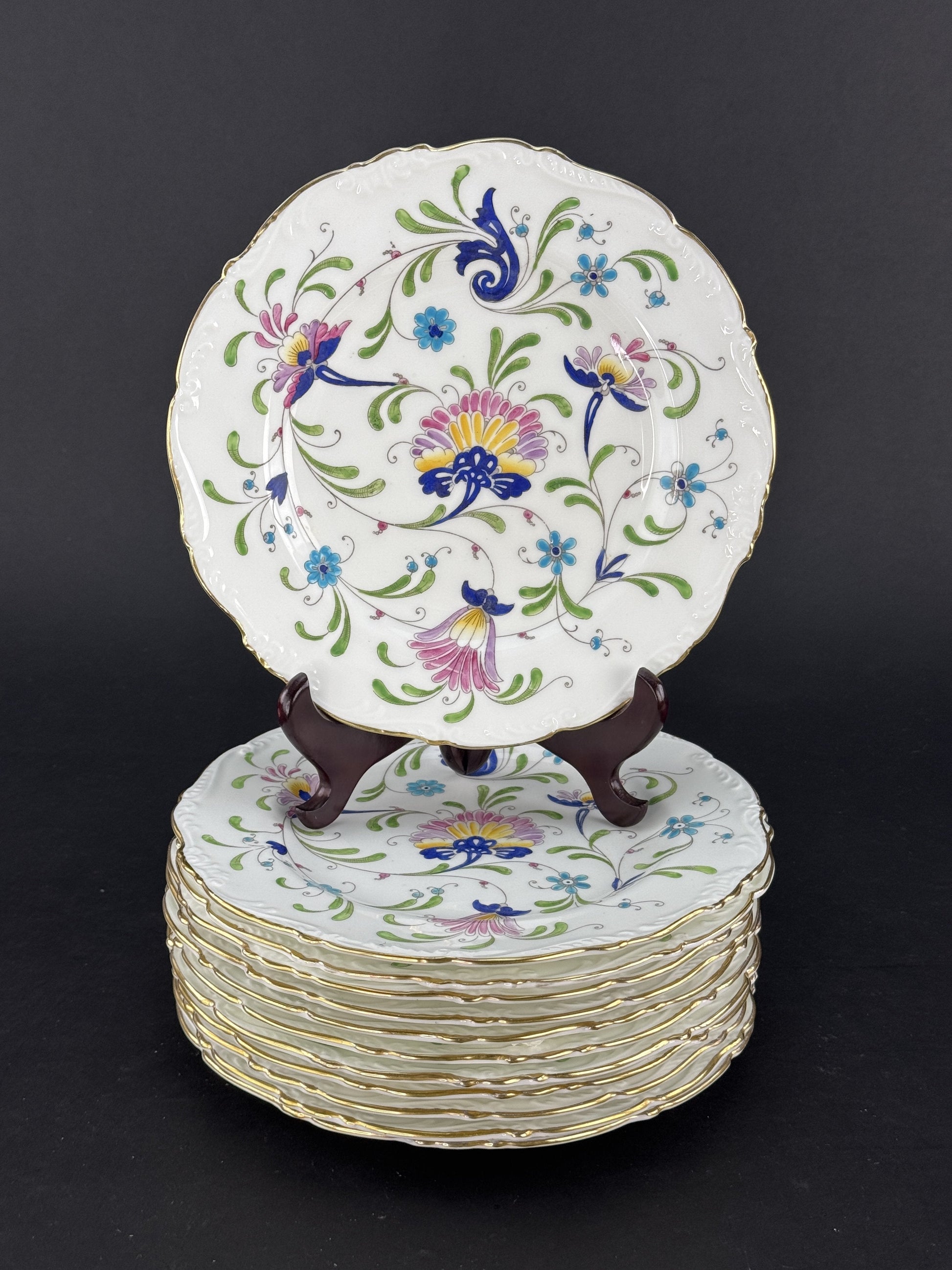 Presented is a fine quality set of 12 salad, lunch or dessert size plates in the Fanfare Japan pattern by Coalport. These are very attractive plates with raised enamel painted decoration. These plates were probably made between 1940 to 1973.