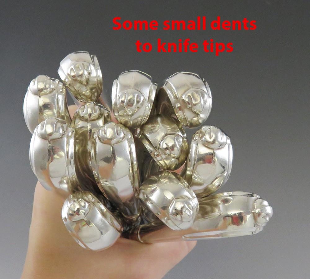 This set is in good overall condition considering age and use. 6 of the knives have small dings on their handles and 7 have small dents to their handle tips. As you can see in the last photograph, the dents to the handle tips are not too major.