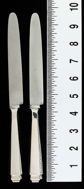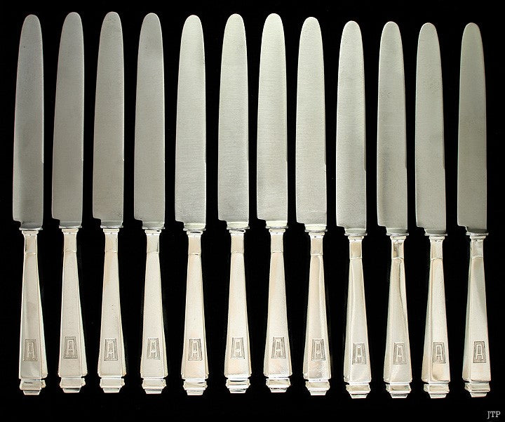 Presented is a wonderful quality set of 12 silver dinner knives made by the highly regarded German silversmiths, M. H. Wilkens & Sohne. Their designers included Peter Behrens, Albin Muller, and Heinrich Vogeler. These are the huge European size dinner knives. They are done in a terrific Art Deco pattern and monogrammed with an A in block script. The knives have silver plated carbon steel blades. This design is very similar to Tiffany & Co.'s Hampton pattern. If you have this pattern, or a similar one, I believe the knives could work quite well with your set.