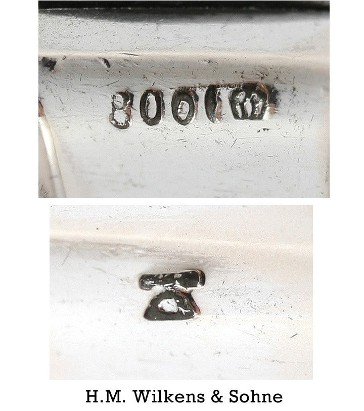 The knives are hallmarked on the handles with the 800, crescent moon and crown for German 800 purity silver and a maker’s mark for M. H. Wilkens & Sohne.