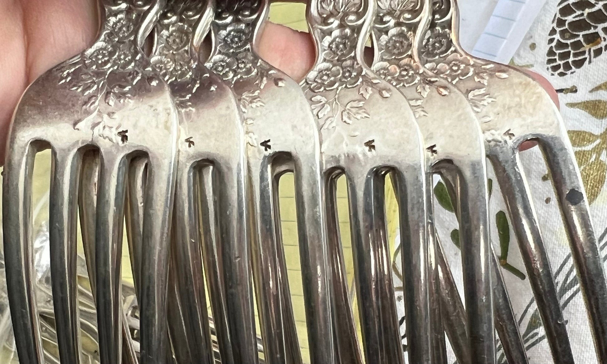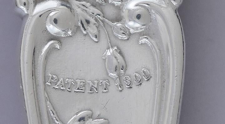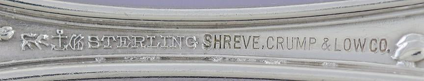 Each fork is stamped with the Gorham maker's mark, sterling silver, the patent date of 1900, and a Gorham year cipher in the shape of a compass for 1908. There is also a retail mark for Shreve, Crump & Low Co.