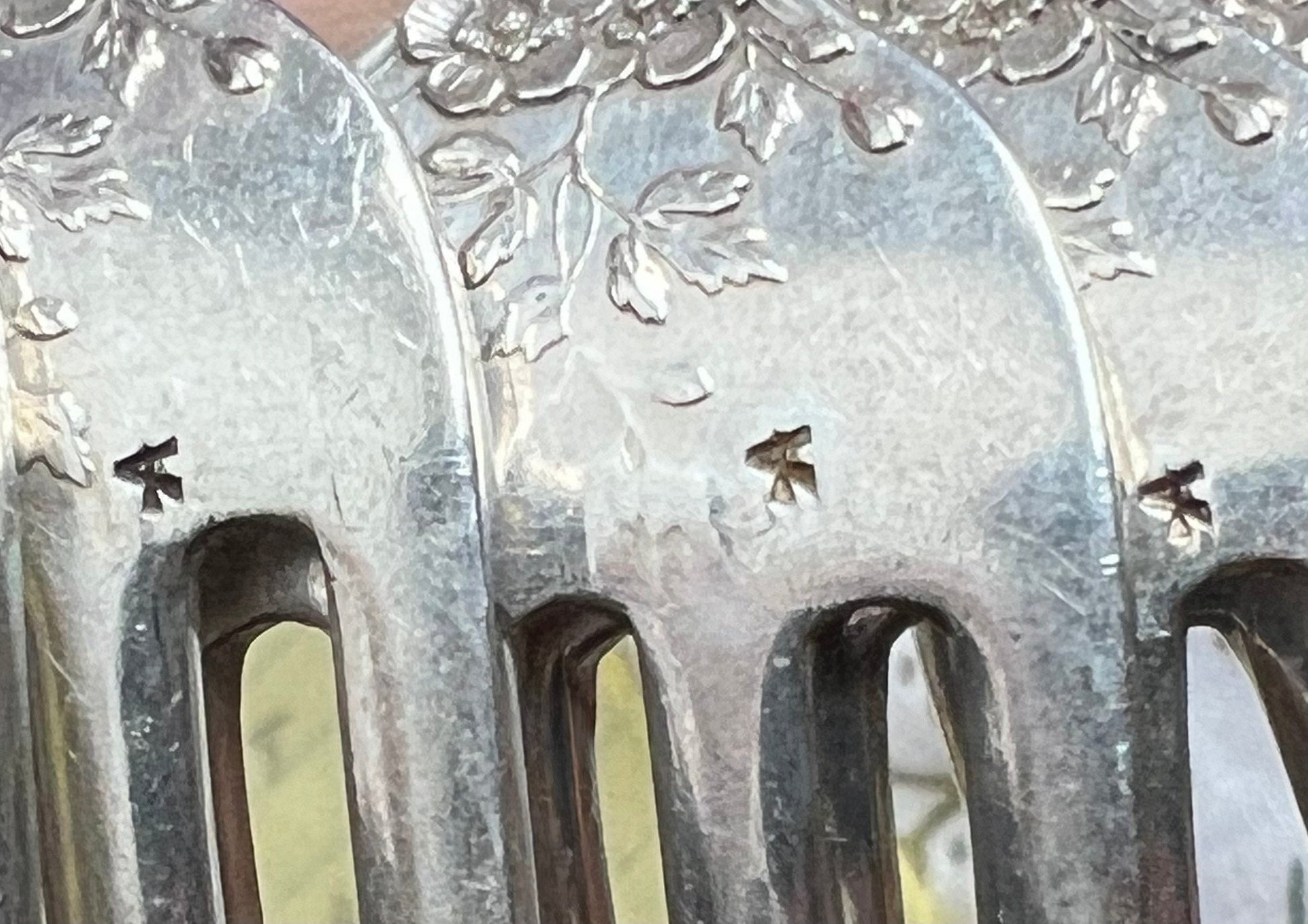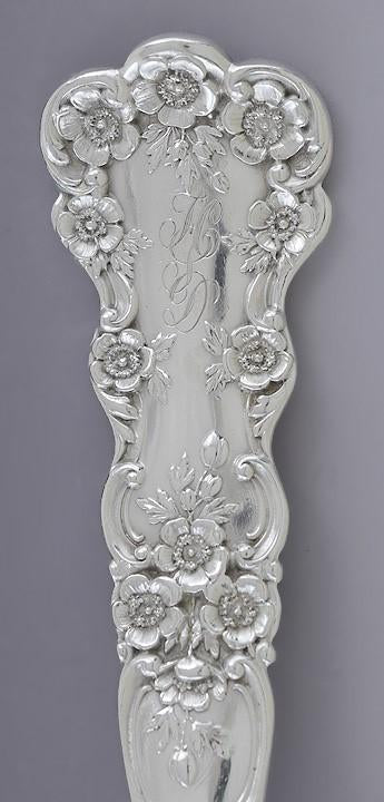 This set is in great condition. The details of the pattern are nice and crisp. There are only the most minor of knife marks to the backs of the tine, nothing noticeable or significant. There are no splits, no breaks, no dents, no monogram removals, and no repairs.